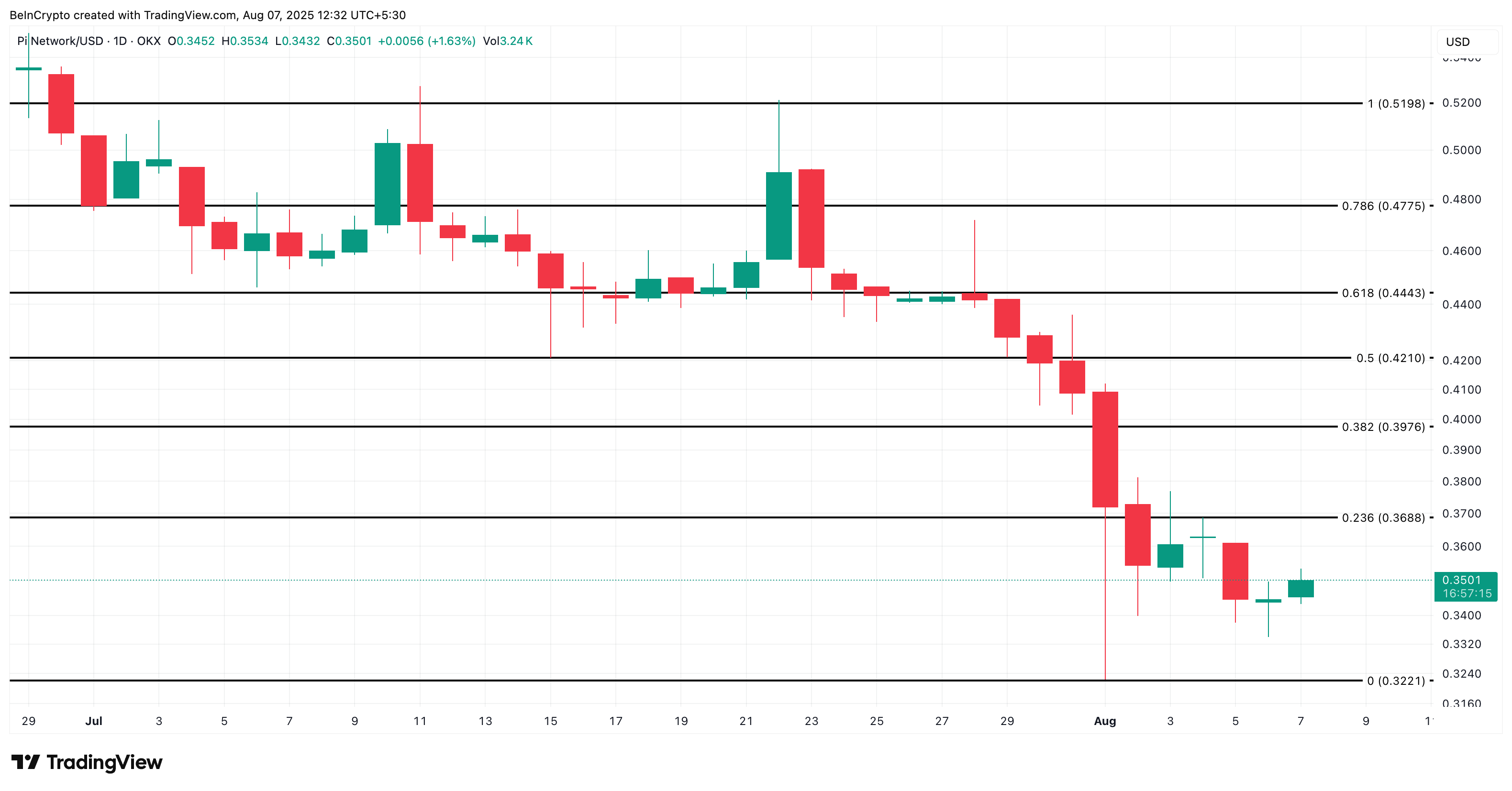 PI narxi bekor qilinishi $0.32 yaqinida joylashgan; agar bu daraja buzilsa, joriy naqsh muvaffaqiyatsiz bo’ladi va yangi pastliklar ehtimoli yuqori.