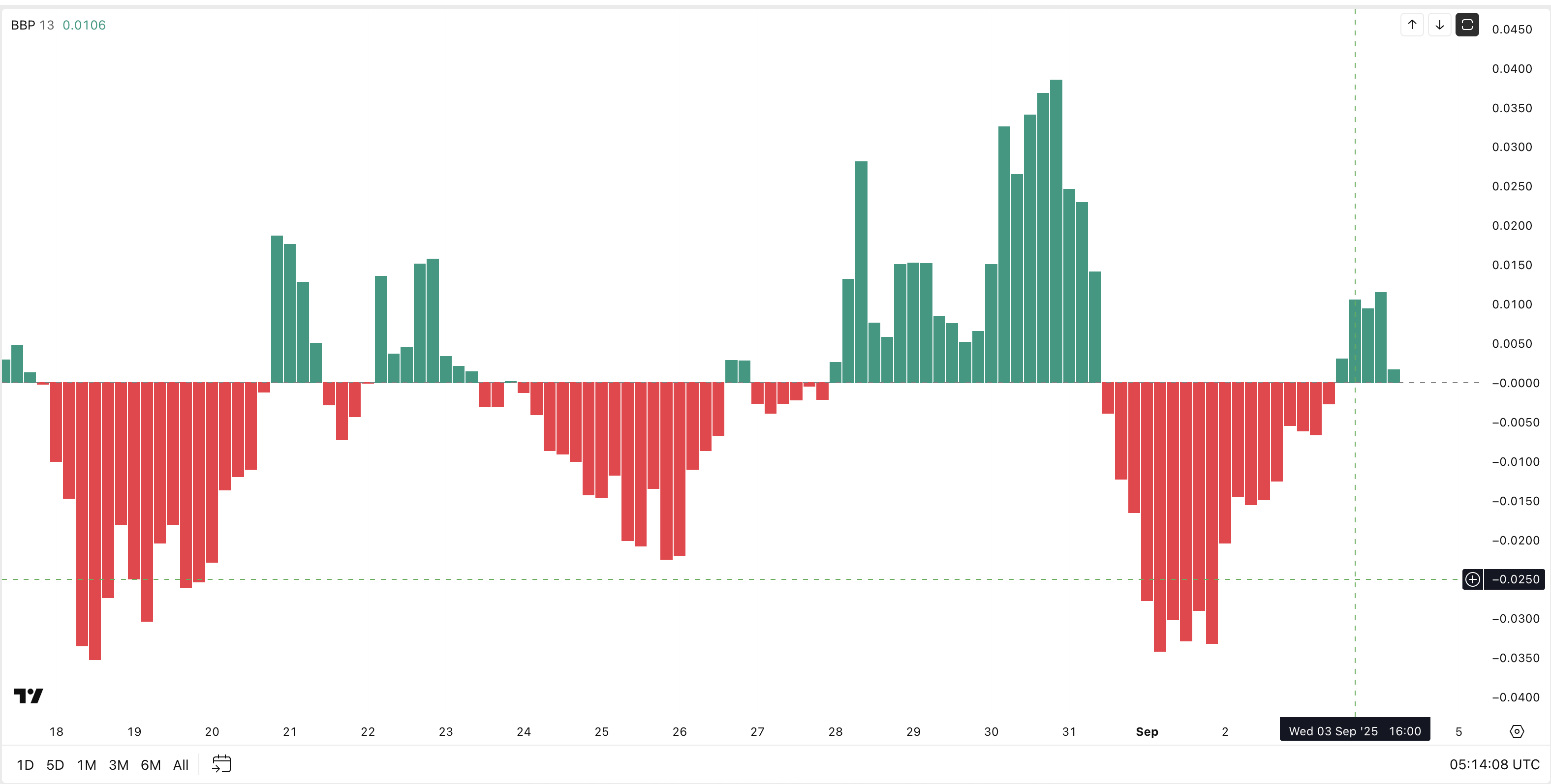 Bu naqsh Bull–Bear Power (BBP) histogrammasi bilan mos keladi, bu narxning ekstremumlarini o’rtacha harakatlanuvchi qiymat bilan solishtirib, kimning nazoratda ekanligini ko’rsatadi.