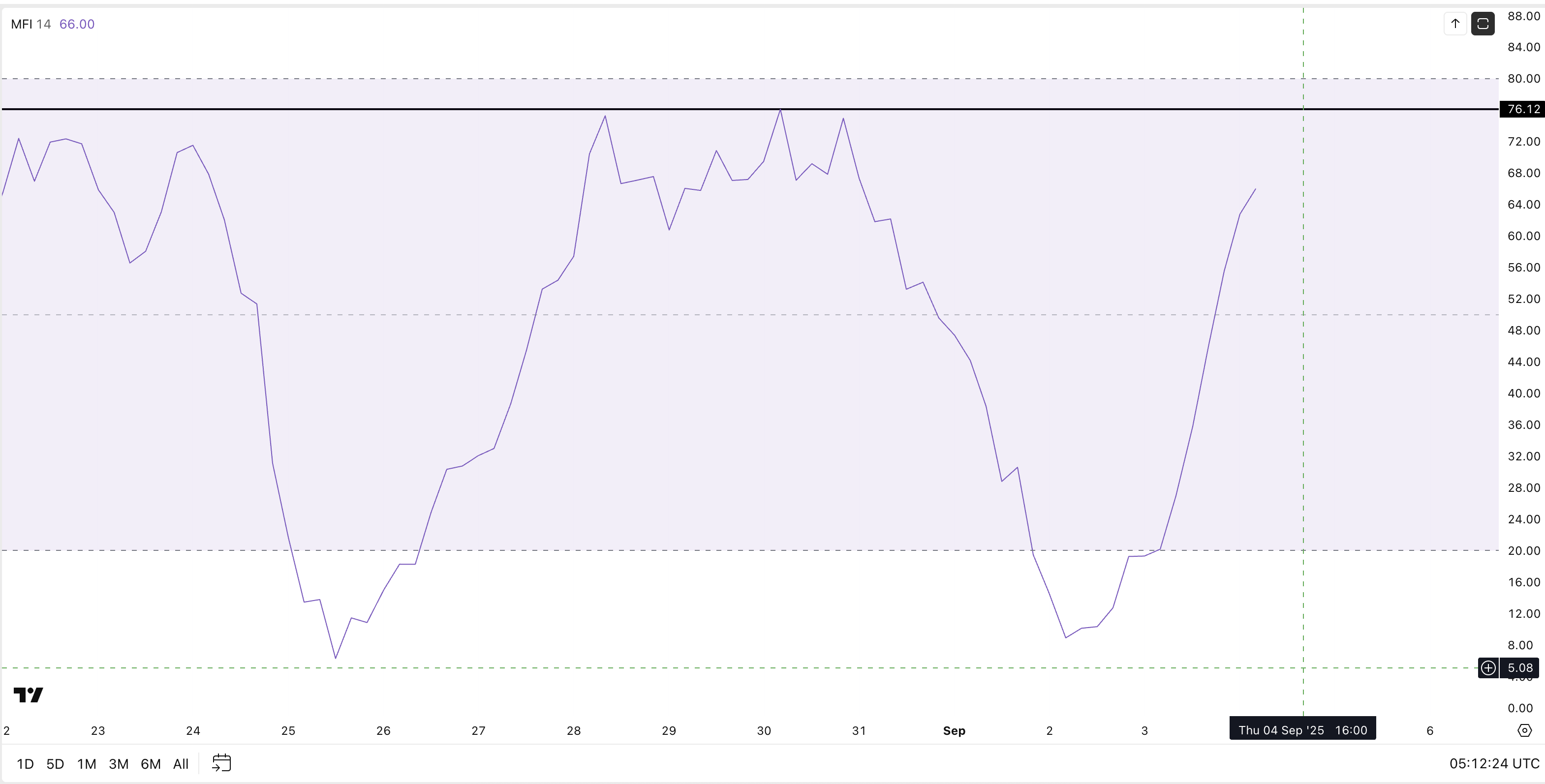 Pul Oqimi Indeksi (MFI) – bu hajmga asoslangan harakat ko’rsatkichi bo’lib, haqiqiy pulning kirishi (sotib olish) yoki chiqishi (sotish)ni ko’rsatadi. Bu indeks 4 soatlik grafikda 66 ga ko’tarildi, hatto «Pi Coin» narxi tebranayotgan bo’lsa ham.