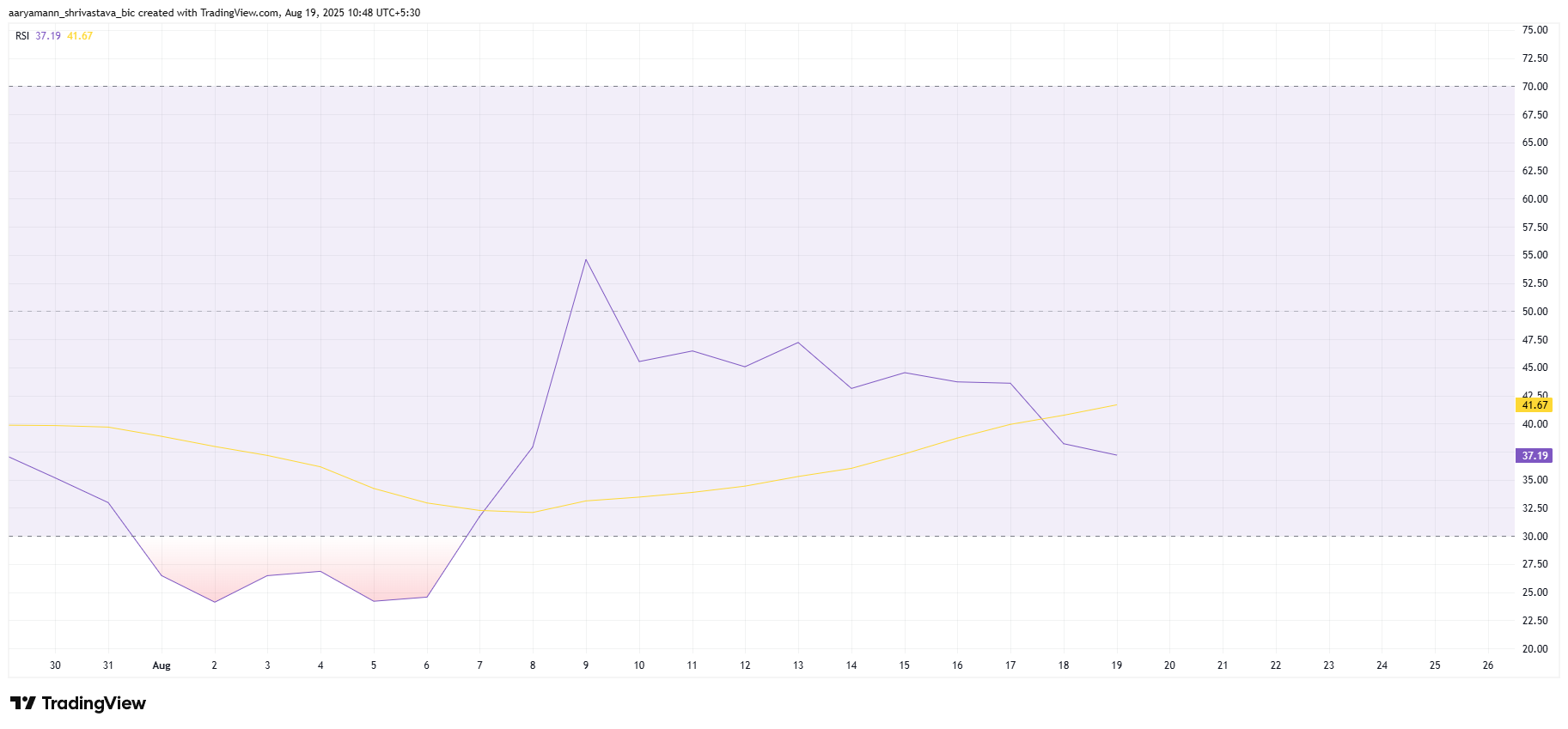 Pi Coin uchun Nisbiy Kuch Indeksi (RSI) keskin pasayishni boshdan kechirdi. Bu ayirbosh bozorining kuchayib borayotganini ko’rsatmoqda. RSI hali 30.0 darajasidagi haddan tashqari sotilgan chegaraga yetmaganligi sababli, narxning o’zgarishi ehtimoli hali uzoq.