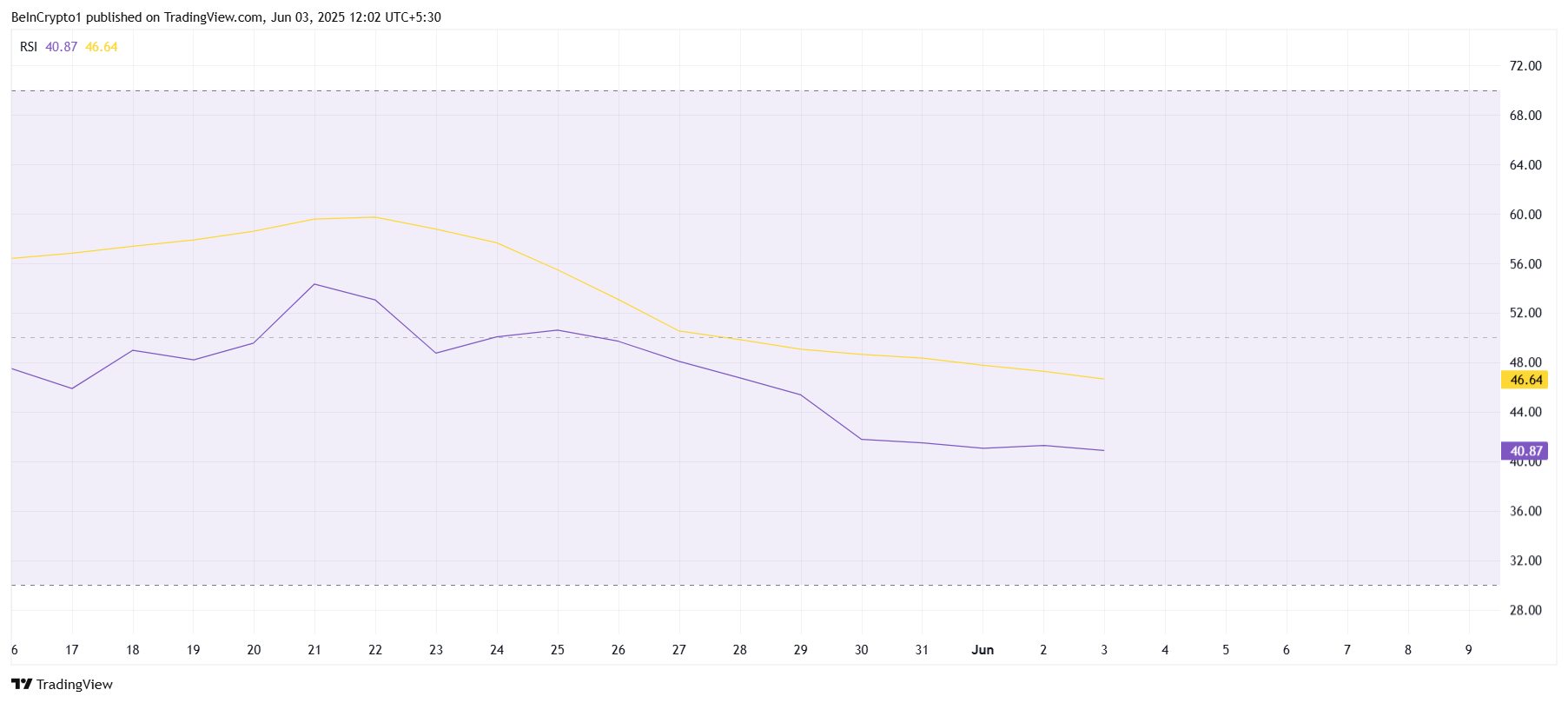 «Pi Network» ijtimoiy tarmog’ining umumiy harakatiga qaraganda, texnik ko’rsatkichlar ayirbosh bosimini ko’rsatmoqda. Nisbiy kuch indeksi (RSI) neytral zonadan pastda qolmoqda, bu altkoinning pasayish harakatini ko’rsatadi. Bu kengroq bozor ko’rsatkichlari bilan birga, zaiflik belgilarini ko’rsatmoqda.