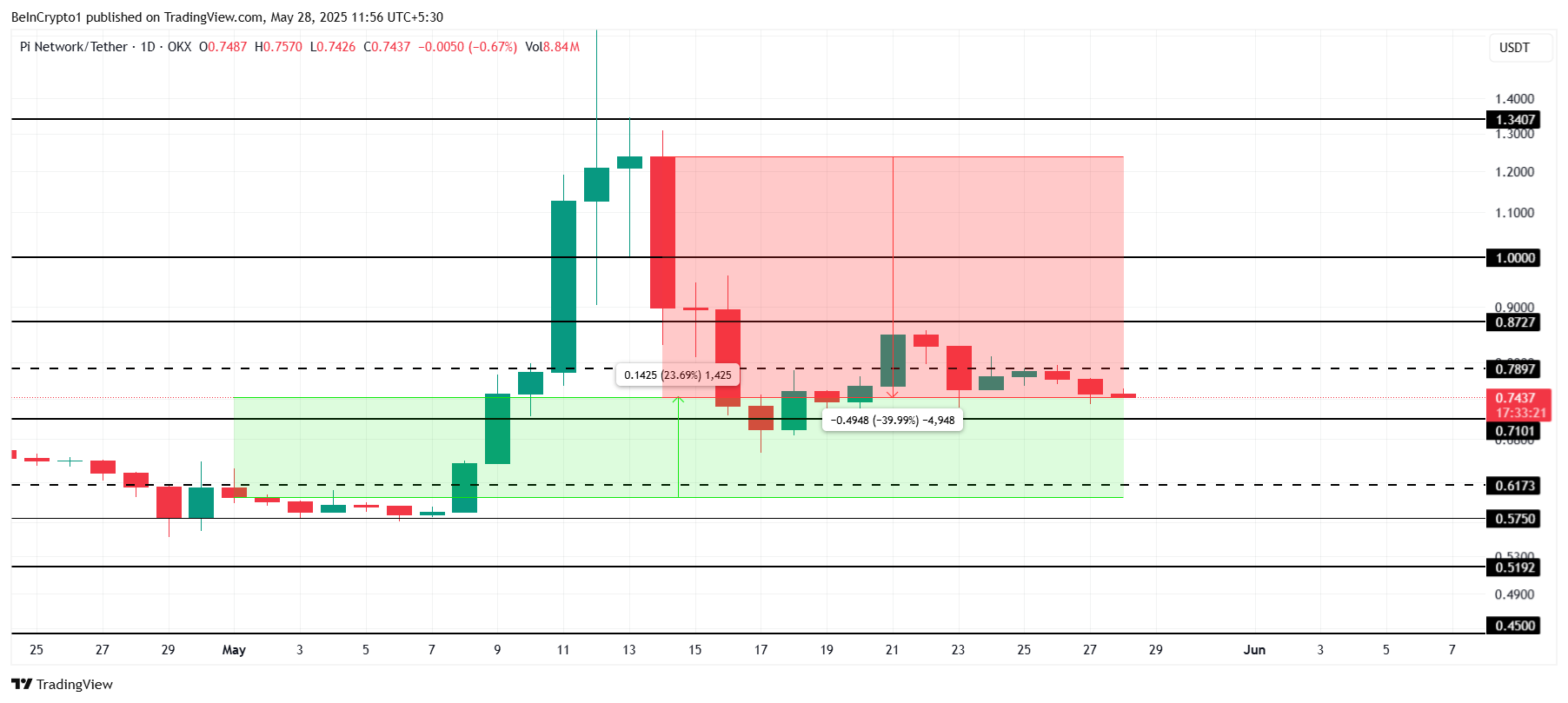 «Pi Network» ijtimoiy tarmog’i hozirda $0.74 narxda savdo qilmoqda. Oyning boshidan beri 23.6% o’sdi, lekin may oyidagi eng yuqori yopilishdan 40% pasaydi. Qolib ketishdan qo’rqish (FOMO) yoki bozorning eng yuqori nuqtasida sotib olgan investorlar hozirda sezilarli yo’qotishlarga duch kelmoqda, chunki narx hali ham qiyinchiliklarga duch kelmoqda.