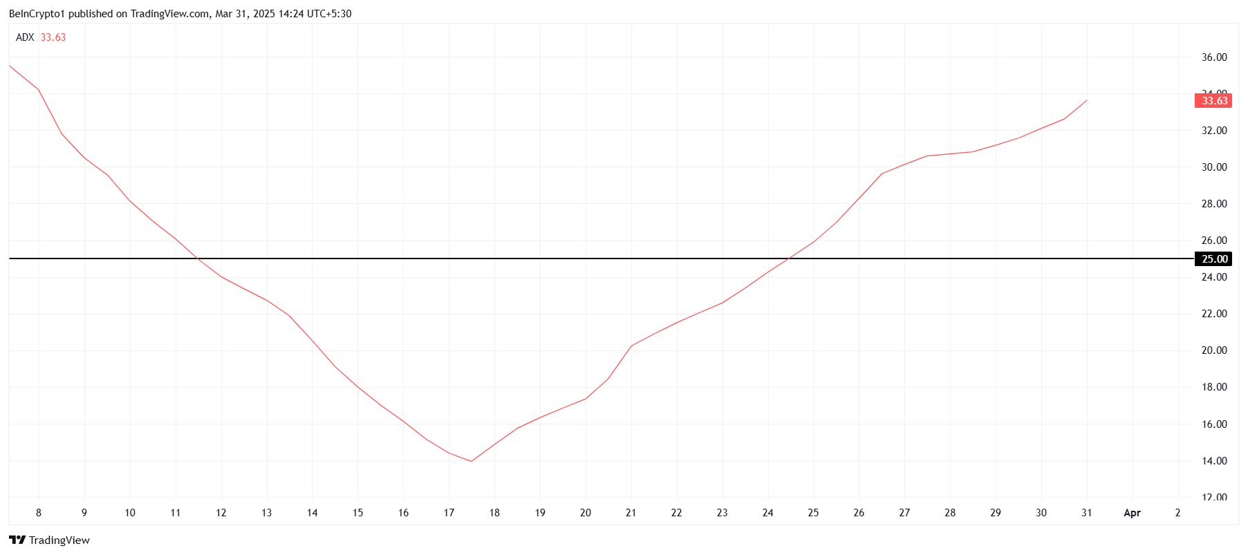 ADX (O’rtacha Yo’nalish Indeksi) yaqinda 25.0 chegarasidan o’tdi, bu esa joriy ayiqcha tendentsiyaning kuchayib borayotganini ko’rsatadi. Bu Pi Network narxi uchun tashvishli signal, chunki ayiqcha tendentsiyaning kuchayishi kriptovalyutaning qisqa muddatda tiklanishini qiyinlashtiradi. ADX salbiy bozor kuchlariga ishora qilayotganligi sababli, Pi Network narxiga bosim kuchayishi mumkin, chunki token o’zining oldingi ATL darajasiga yaqinlashmoqda.