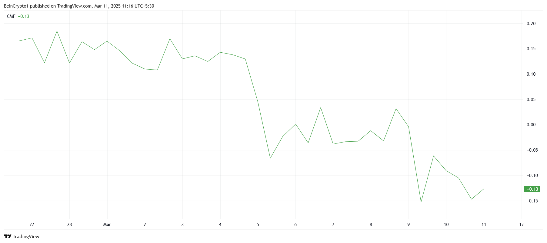 Chaikin Money Flow (CMF) so’nggi bir necha kun davomida qat’iy ravishda ayiq zonada qoldi, bu esa bozorni chiqimlar egallab olganini ko’rsatadi. Ko’proq sarmoyadorlar o’z mablag’larini Pi Networkdan olib chiqmoqda, bu esa ehtimoliy yo’qotishlar haqidagi xavotirlar tufayli bo’lishi mumkin.