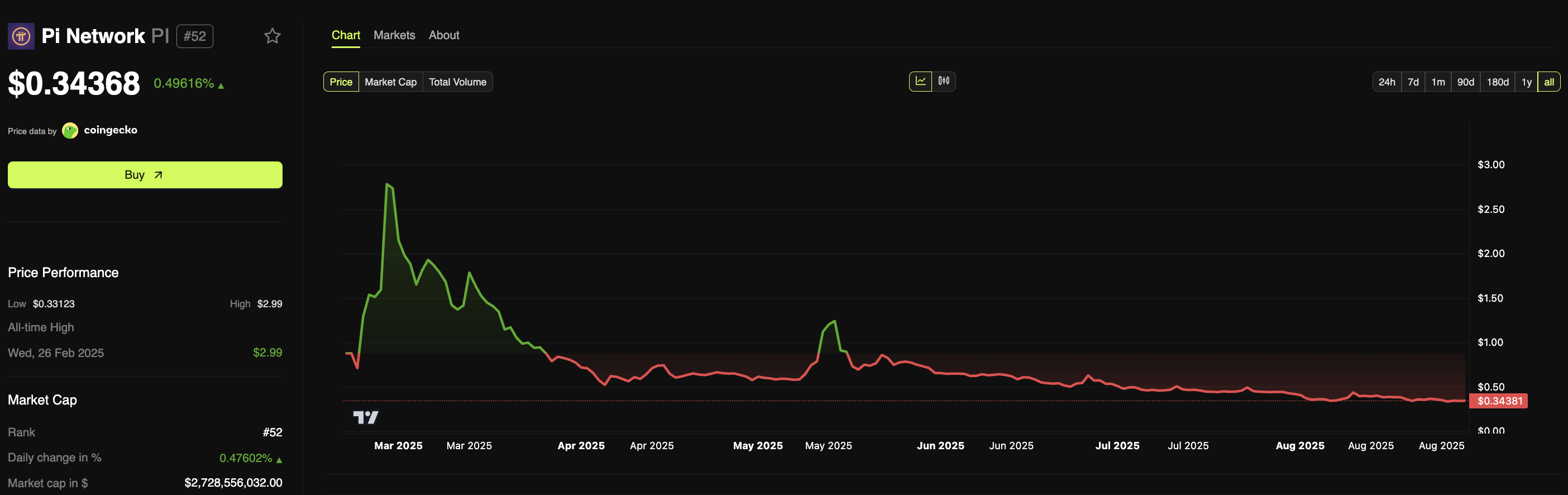 Haqiqiy vaqt ma’lumotlari PI’ning bozorda taxminan $0.34 atrofida savdo qilayotganini ko’rsatmoqda. Bu uning tarixiy minimumi $0.3312 (2025-yil 26-avgust) dan biroz yuqoriroq. Bu nozik farq ayirbosh hissiyoti kuchaysa, osonlikcha buzilishi mumkin. Eng so’nggi tarixiy maksimum o’tgan fevral oyida $2.99 da qayd etilgan edi. Bu yilning avvalgi yutuqlarini o’chirib tashlagan oylik barqaror pasayishni ko’rsatadi.
