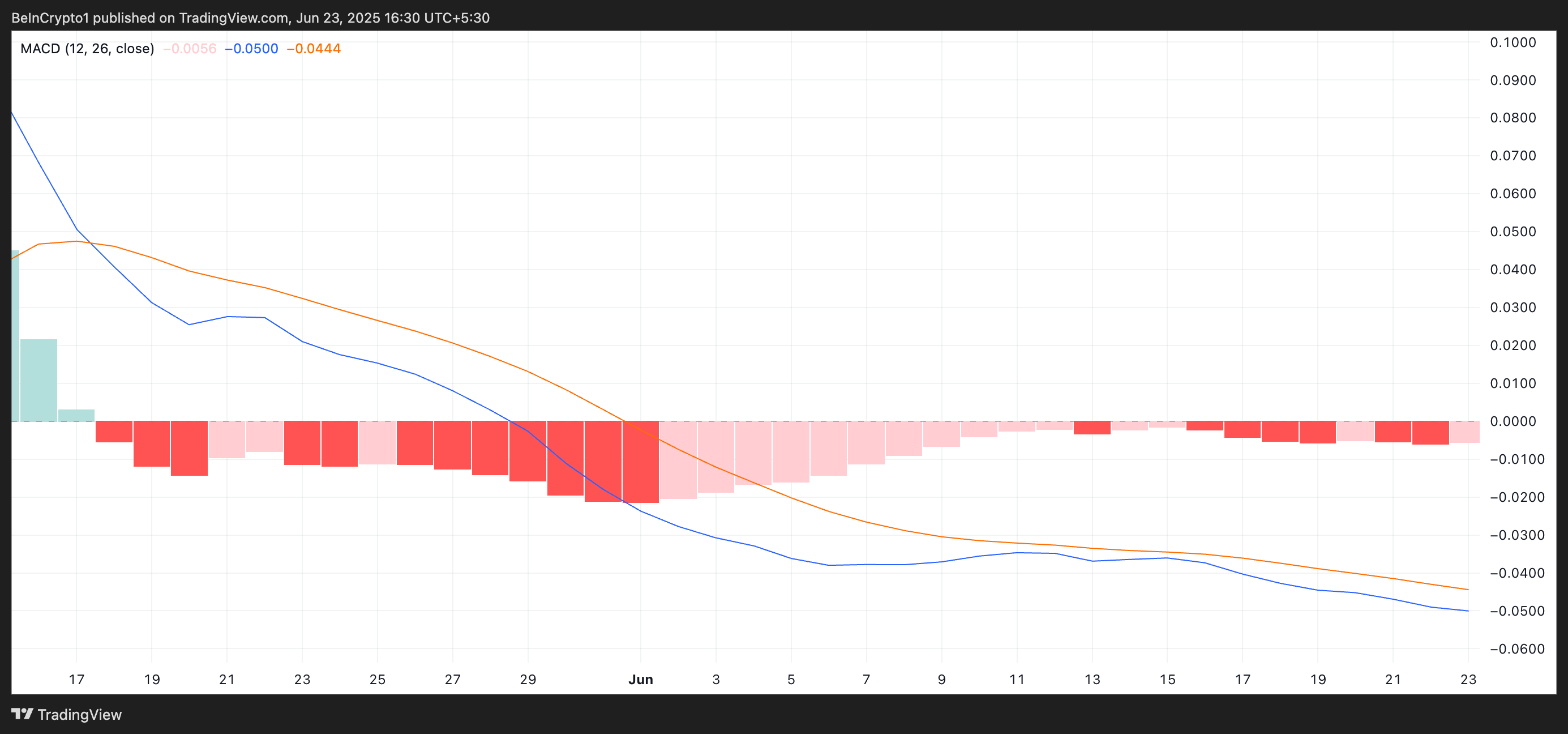 Bundan tashqari, texnik ko’rsatkichlar token atrofidagi hissiyotning susayishini tasdiqlaydi. Masalan, PI ning Harakatlanuvchi O’rtacha Konvergentsiya Divergentsiyasi (MACD) indikatori ayirbosh signallarni ko’rsatishda davom etmoqda, uning MACD chizig’i (ko’k) hali ham signal chizig’idan (to’q sariq) pastda.