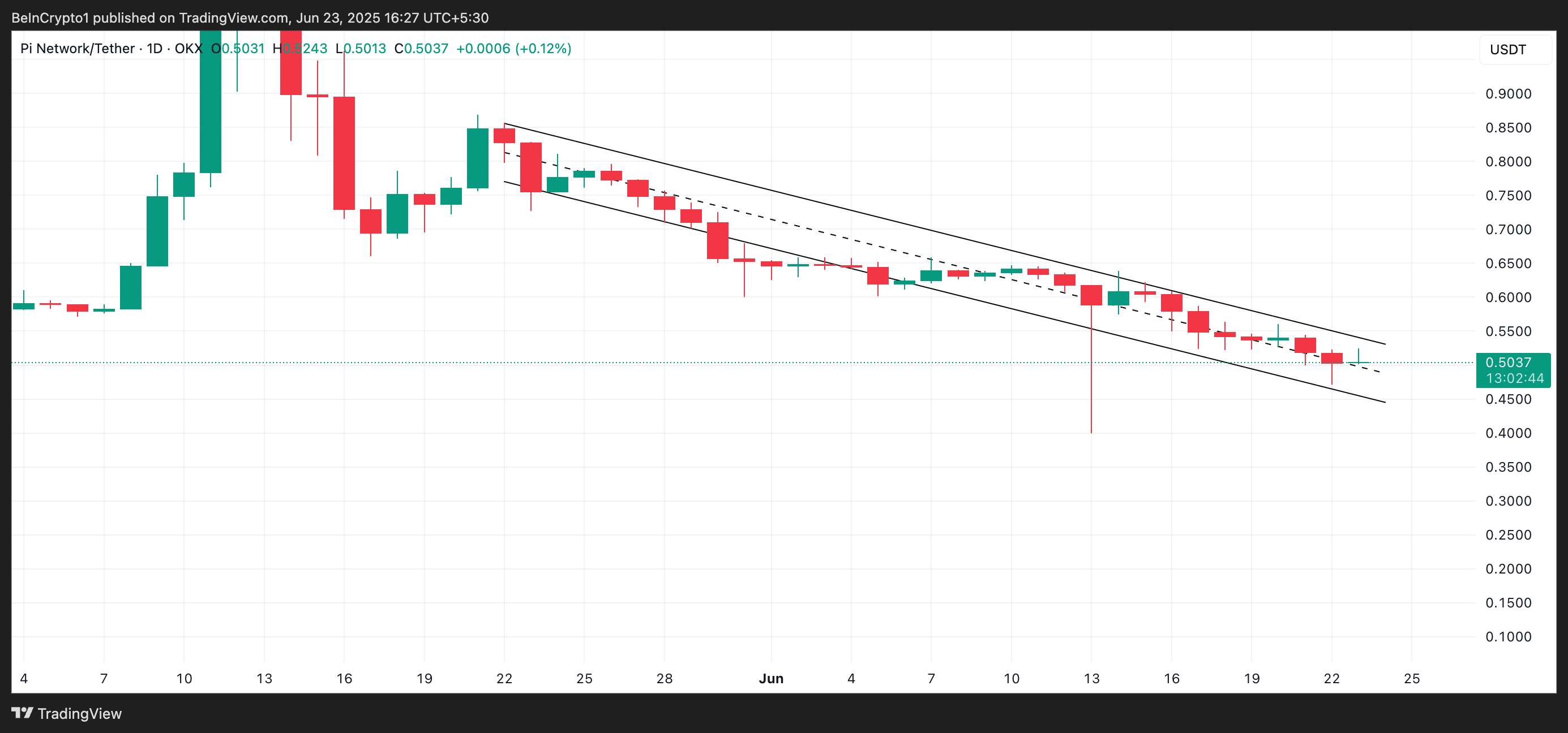 PI/USD bir kunlik jadvalidagi ko’rsatkichlar shuni ko’rsatadiki, altkoin 22-maydan beri pasayuvchi parallel kanal ichida harakatlanib, 40% ga tushib ketgan.