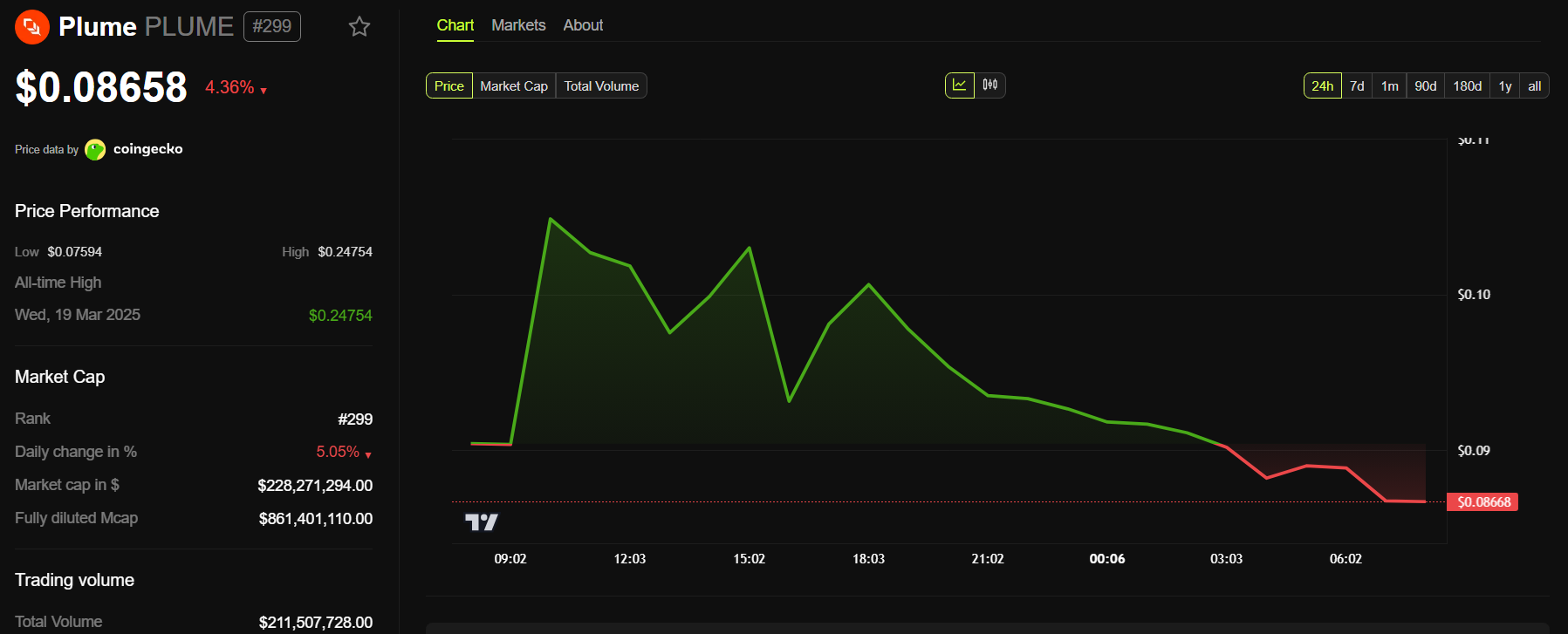 «Binance» ro’yxatga olishidan so’ng, PLUME 30% dan ortiq o’sib, $0.11 dan oshdi. Bu o’sish jamoa shov-shuvi va chakana savdogarlar oqimidan kelib chiqdi. Uning 24 soatlik savdo hajmi $200 milliondan oshdi, bu avvalgi kunlarga nisbatan 10 barobar ko’pdir.