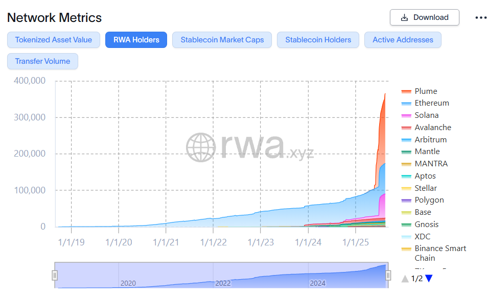 Bundan tashqari, «RWA.xyz» ma’lumotlariga ko’ra, Plume hozirda boshqa tarmoqlarga nisbatan eng ko’p RWA egalariga ega, 191,000 dan ortiq, bu esa uning umumiy token egalari sonidan ham yuqori.
