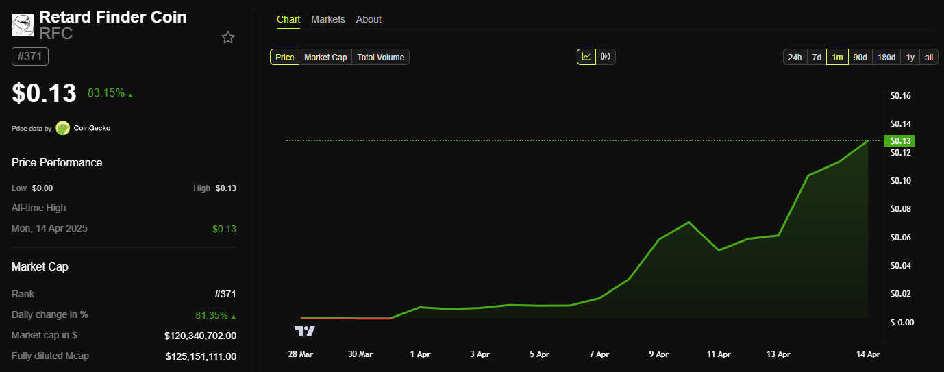 Meme tangalariga bo’lgan qiziqish pasayganida, Retard Finder Coin (RFC) kutilmaganda e’tiborga tushdi. Uning narxi keskin oshib, bozor qiymati 100 million dollardan oshdi.