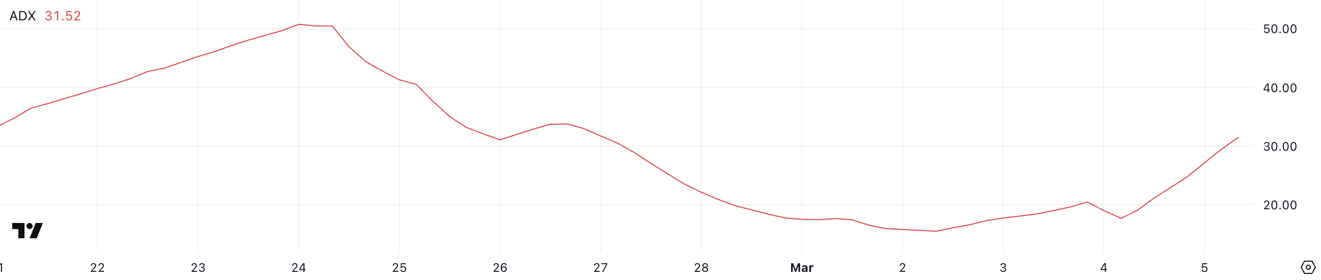 Umuman olganda, 25 dan yuqori qiymatlar kuchli trendni ko’rsatadi, 20 dan past o’qishlar esa zaif yoki noaniq bozor sharoitlarini bildiradi. SFM’ning ADX hozirda 31.5 da bo’lib, bu momentning kuchayganini tasdiqlaydi va yuqoriga qarab barqaror harakat qilish ehtimolini qo’llab-quvvatlaydi. Biroq, ADX trend kuchini ko’rsatsa-da, yo’nalish sotib olish bosimi ustun bo’lib qoladimi yoki yo’qmi, shunga bog’liq bo’ladi.