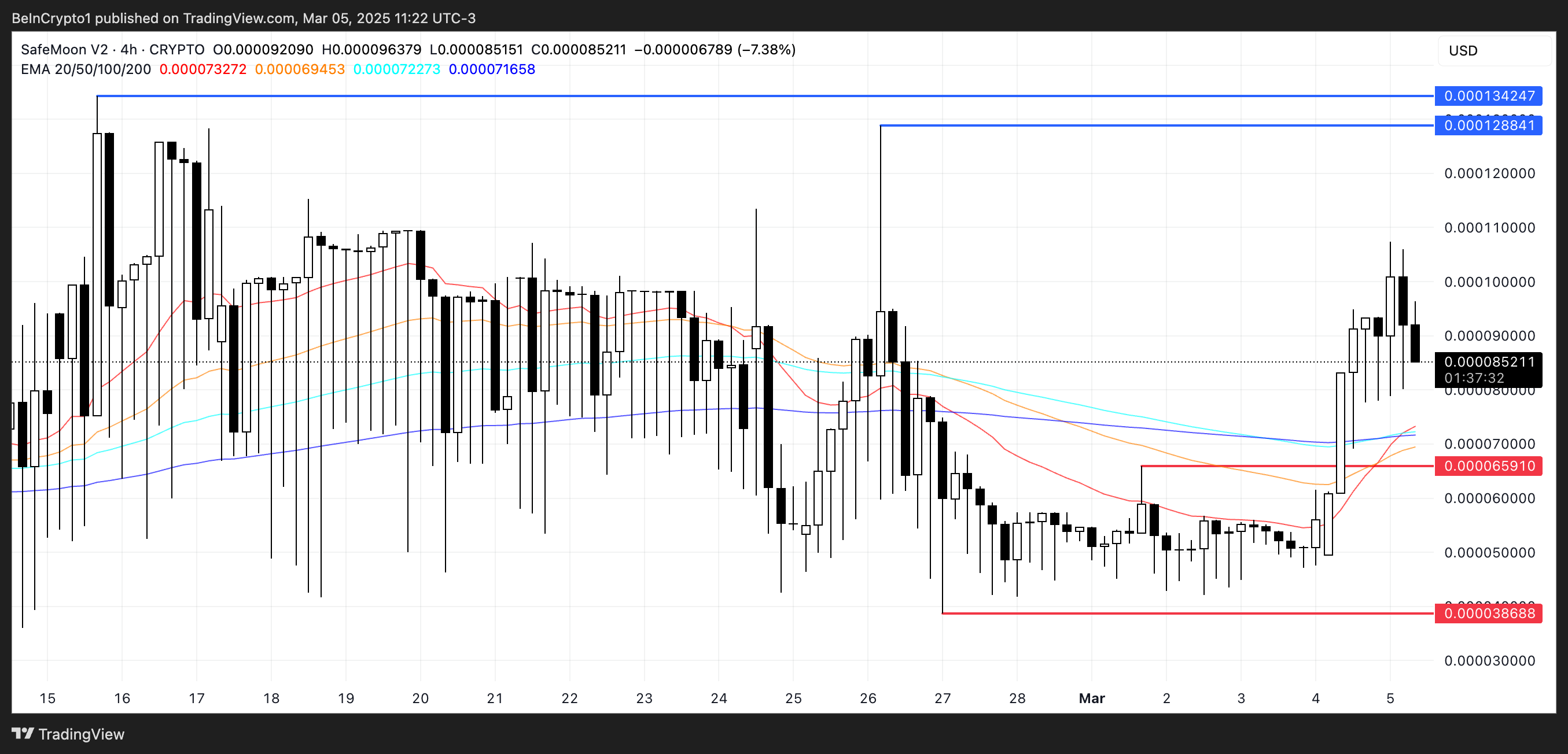 SafeMoon EMA chiziqlari hozirda oltin kesish hosil qilmoqda, bu ko’pincha yuqoriga qarab momentdan oldin keladigan bullish signal. Oltin kesish qisqa muddatli EMA uzoq muddatli EMA dan yuqoriga o’tganda sodir bo’ladi, bu esa bullish bozor sharoitlariga o’tishni ko’rsatadi.