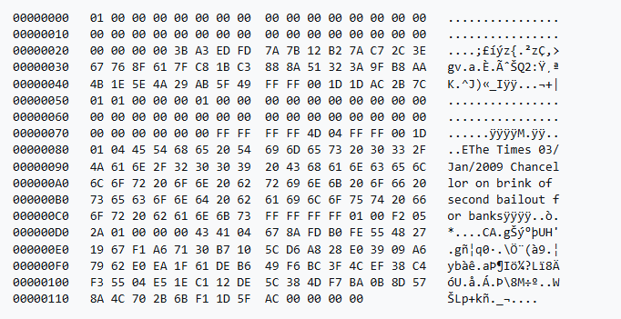 Bitcoinning birinchi blokiga quyidagi sarlavha kiritilgan: “The Times 03/Jan/2009 Kantsler banklar uchun ikkinchi qutqaruv choralari arafasida.” Ushbu satr Buyuk Britaniya gazetasidan olingan.