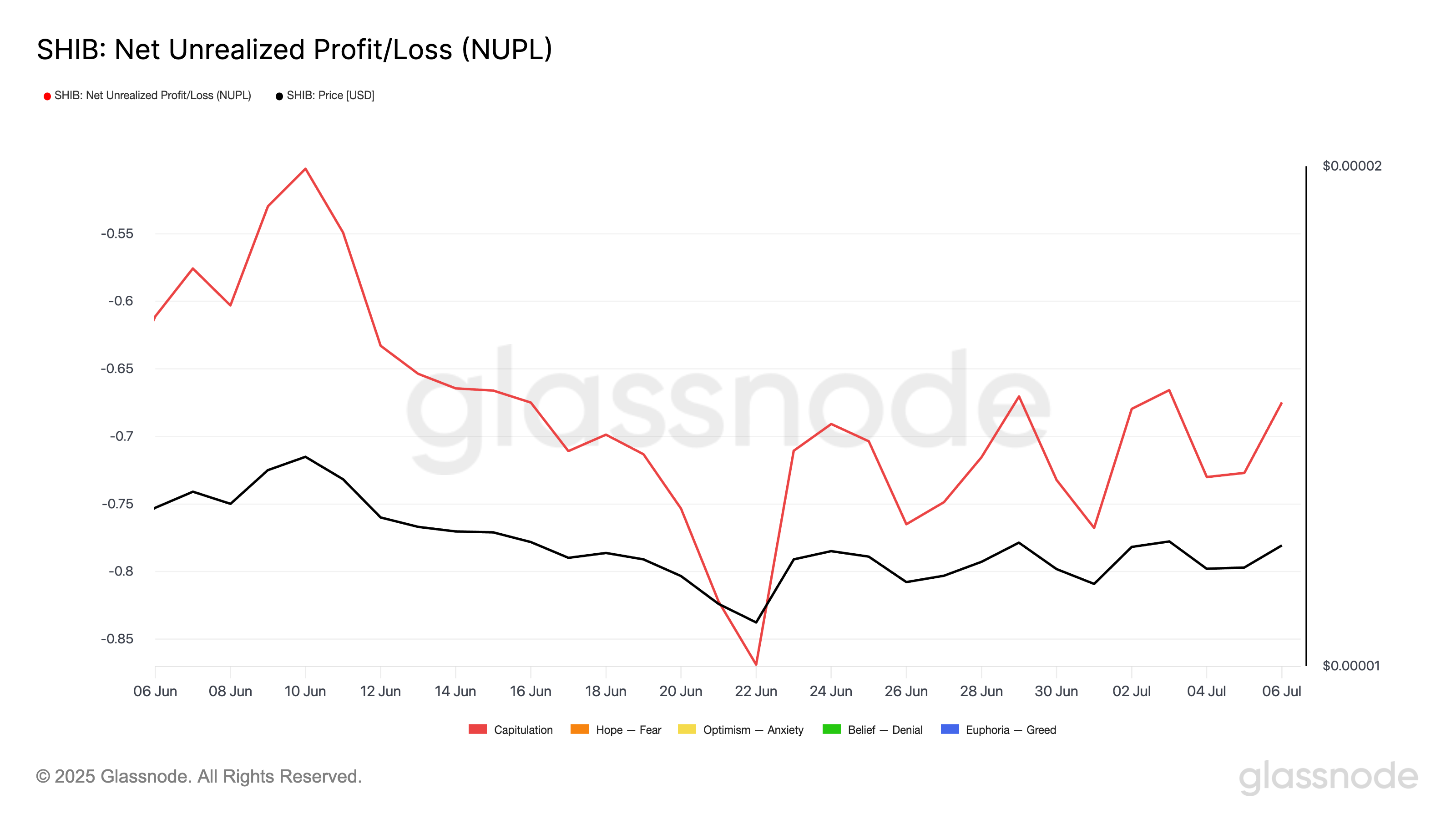 «Glassnode» ma’lumotlariga ko’ra, SHIBning Sof Amalga Oshmagan Foyda/Zarar (NUPL) indikatori memkoinning taslim bo’lish zonasida ekanligini ko’rsatmoqda.
