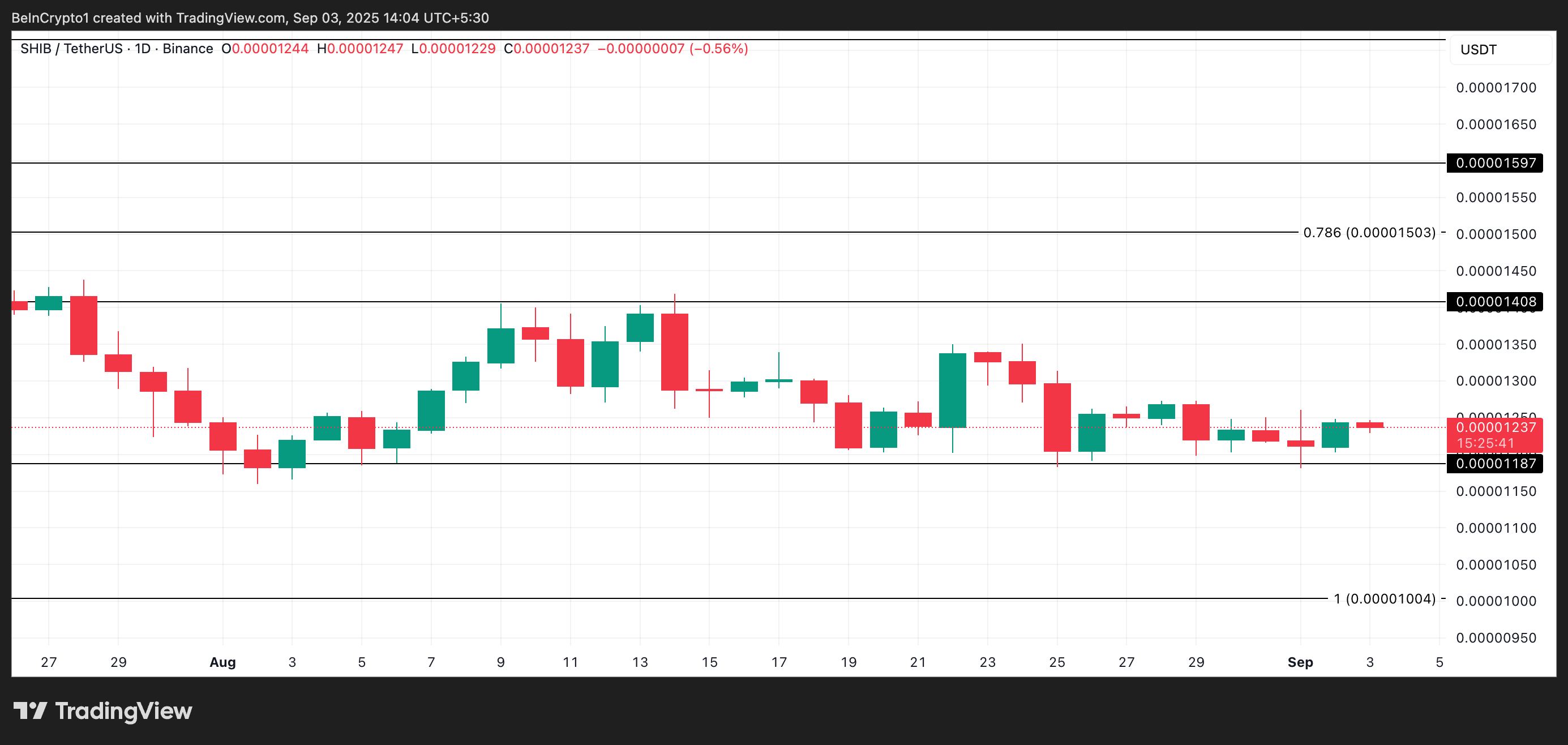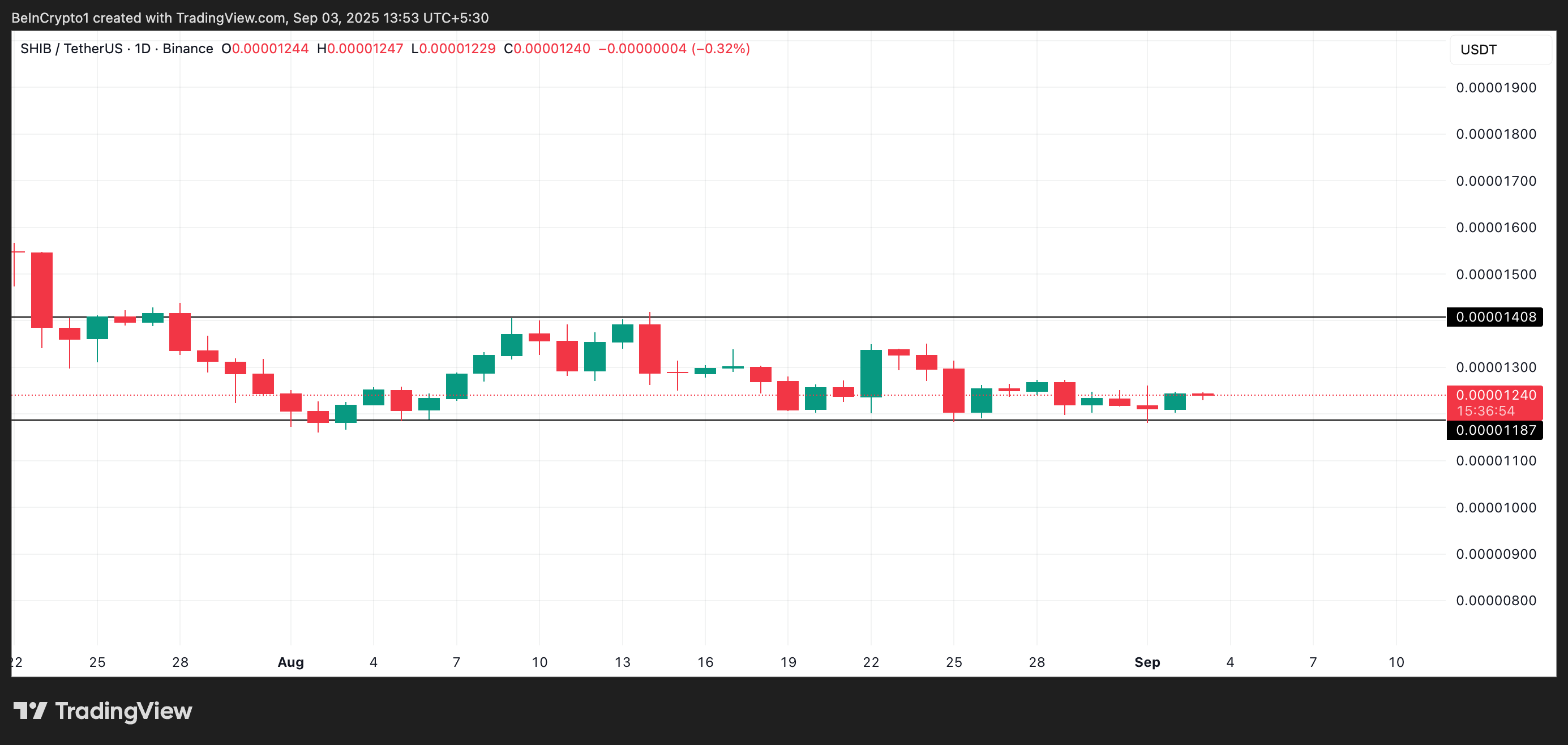 SHIB/USD bir kunlik jadvalidan olingan ma’lumotlar, memkoinning o’tgan oy davomida ma’lum bir diapazonda harakatlanganini ko’rsatmoqda. U $0.00001408 atrofida qarshilikka duch kelgan, $0.00001187 yaqinida esa qo’llab-quvvatlash topgan.