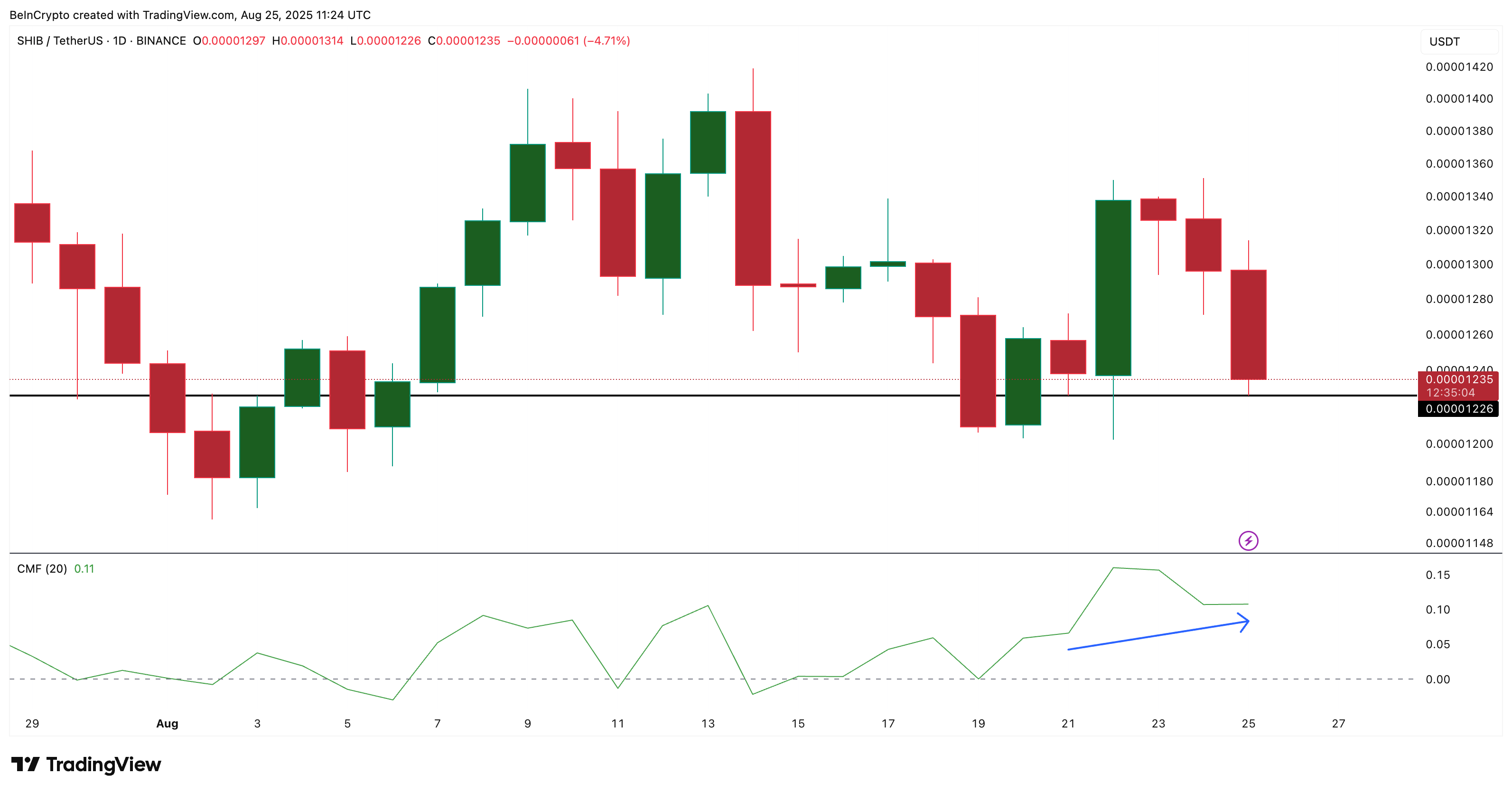 Bu diapazon o’tmishda kuchli qo’llab-quvvatlash sifatida xizmat qilgan va yangi kirishlar Shiba Inu narxi bu yerda ushlab turilganini tushuntiradi. Shuningdek, CMF gipotezasiga ko’ra, $0.00001226 SHIB uchun muhim qo’llab-quvvatlash hisoblanadi, chunki bu darajada yangi xaridlar kuzatilgan.