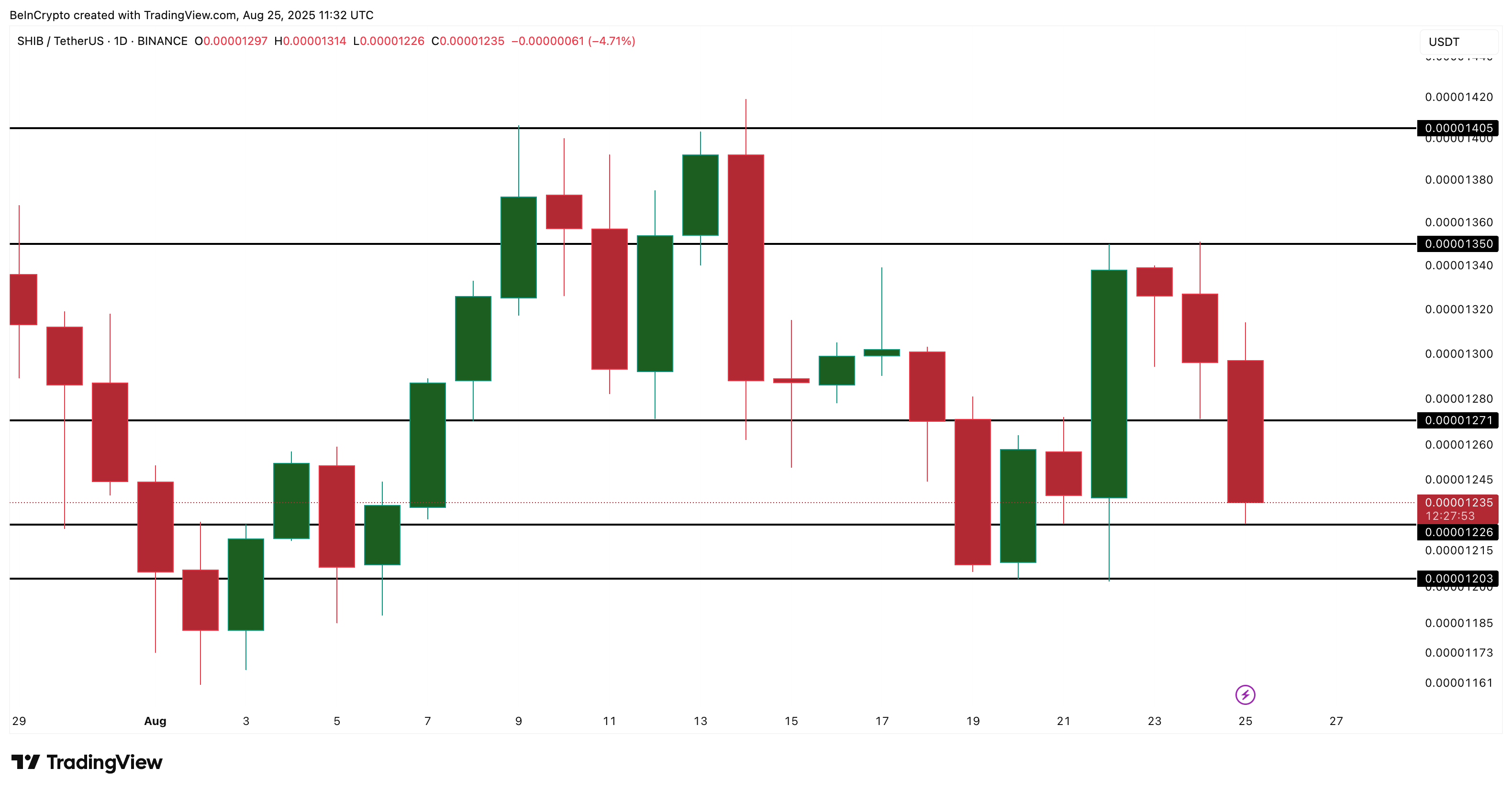Umumiy tuzilma hali ham nozik. Shiba Inu narxi $0.00001235 da savdo qilmoqda, kuchli yig’ilish zonasidan biroz yuqorida, ya’ni $0.00001203 yaqinida.