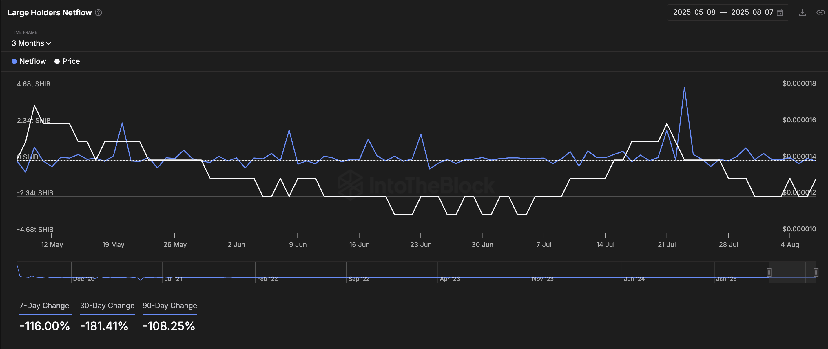 SHIB uchun yirik egalar netflow tendensiyasi aniq salbiy bo’lib qolmoqda. So’nggi 30 kun ichida yirik investorlar o’zlarining SHIB pozitsiyalarini 181% dan ko’proqqa qisqartirdilar. So’nggi 3 oy ichida esa sezilarli kirim kuzatilmagan.