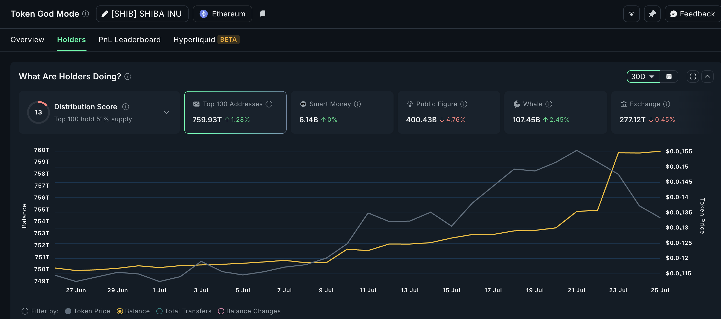 Yirik investorlar ham faol. «Nansen»ning 30 kunlik ma’lumotlariga ko’ra, yirik hamyonlar o’zlarining «SHIB» zaxiralarini 2,58 milliardga oshirdi, bu hozirgi narxlarda taxminan $38,651 ga teng. Yirik investorlarning umumiy zaxirasi hozirda 107,45 milliard «SHIB»ni tashkil etadi.