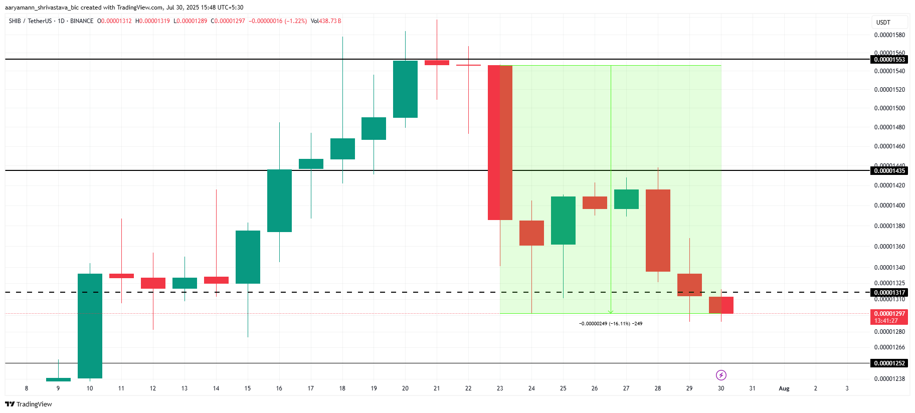 «Shiba Inu» (SHIB) narxi yaqinda sezilarli darajada pasaydi, iyul oyida erishgan yutuqlarining yarmidan ko’pini yo’qotdi. Hozirda $0.00001297 narxda savdo qilmoqda, bu memkoin so’nggi haftada 16% pasayishni boshdan kechirdi.
