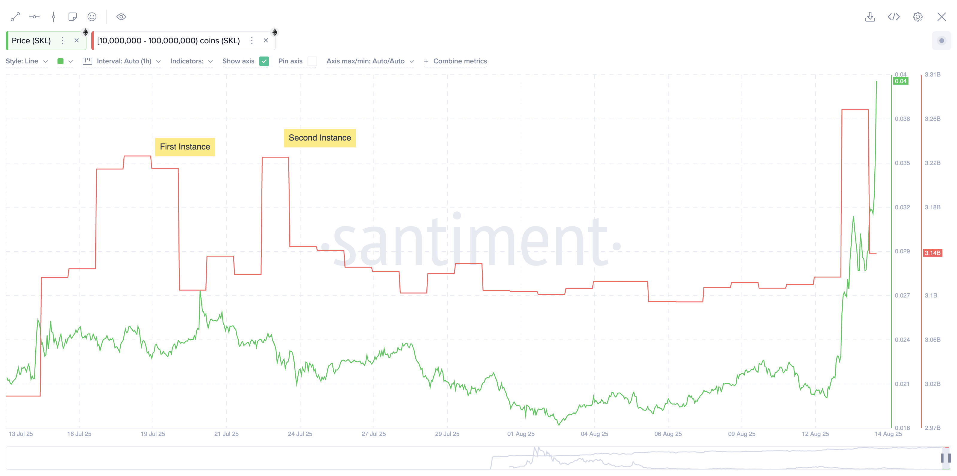 Iyul oyida kichik mahalliy cho’qqilar (taxminan 15-iyul, 24-iyul va 29-iyul) keyingi sessiyalarda «SKALE» narxining pasayishi bilan kuzatildi. Harakatsiz tokenlar katta miqdorda harakatlana boshlaganda, bu odatda bozorga taklifning qaytishini anglatadi; tarixan, bu o’sishning davom etishiga to’siq bo’lgan.