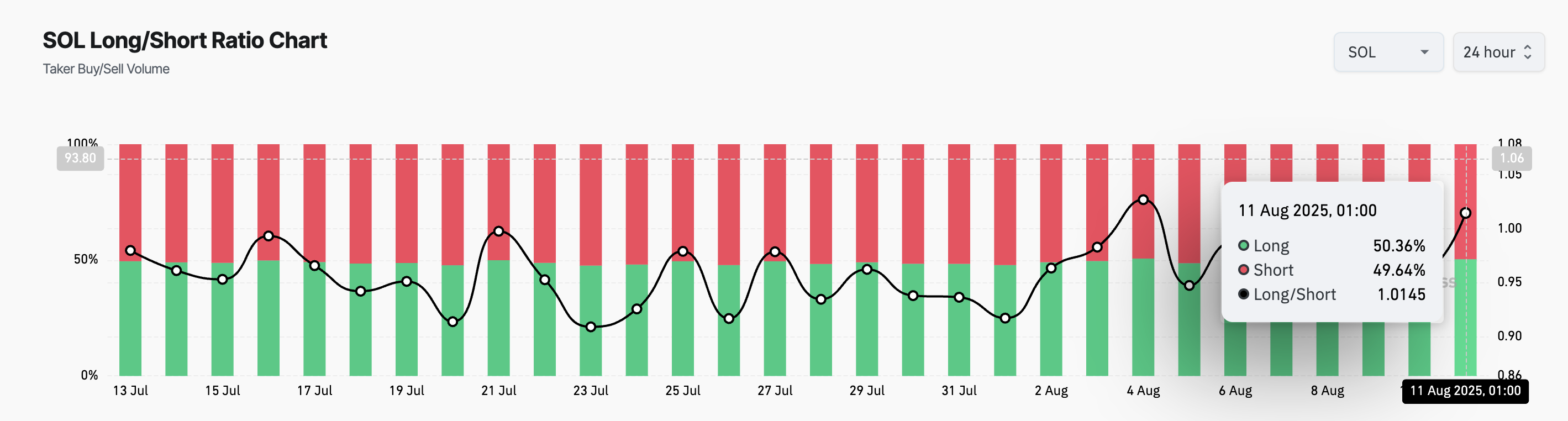 Bundan tashqari, Solana derivativlar bozorida sotib olish bosimi sezilarli darajada yuqori. Bu tokenning hozirgi uzun/qisqa nisbati 1.01 ekanligi bilan aks etadi.