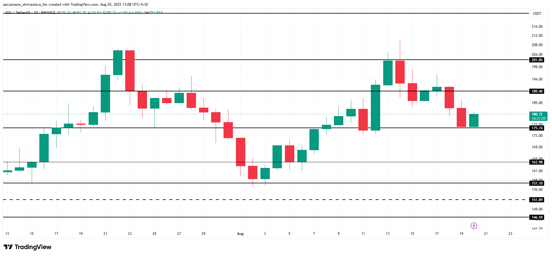 Yozish vaqtida Solana narxi $180da, $175 qo’llab-quvvatlash darajasidan yuqorida turibdi. Davom etayotgan investorlar xatti-harakatlari tufayli sezilarli pasayish ehtimoli hozircha past ko’rinadi. Narx yetilayotgan saqlovlar va barqaror investor qiziqishi bilan yaxshi qo’llab-quvvatlanmoqda.