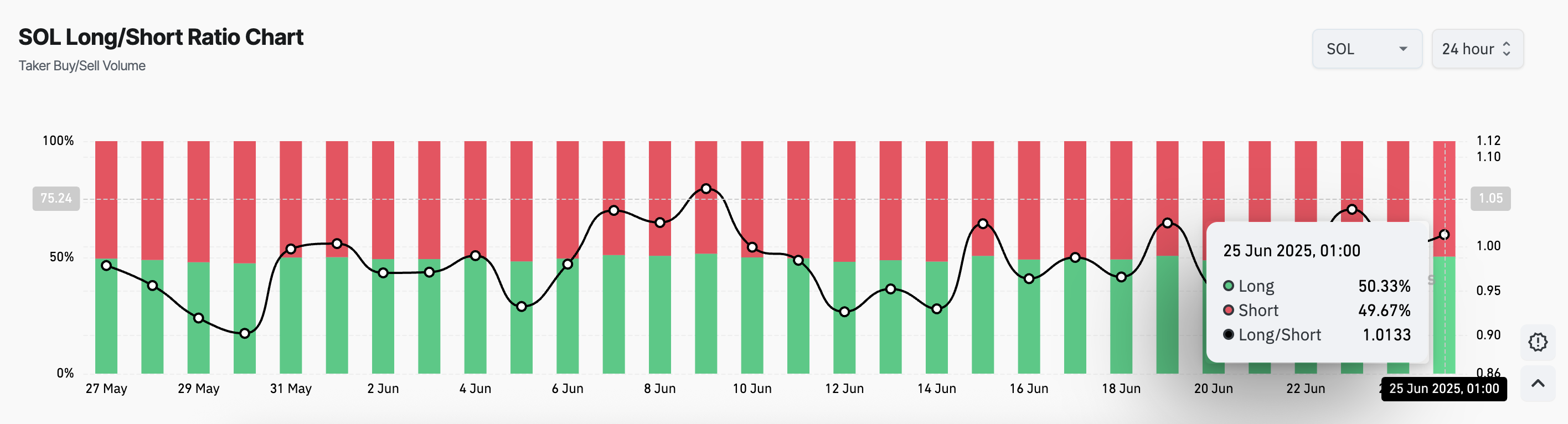 Ushbu nisbat bozordagi uzun va qisqa pozitsiyalar sonini solishtiradi. Agar aktivning uzun/qisqa nisbati 1 dan yuqori bo’lsa, bu uzun pozitsiyalar qisqa pozitsiyalardan ko’proq ekanligini bildiradi, ya’ni SOL savdogarlari narxning oshishiga ko’proq ishonishmoqda.