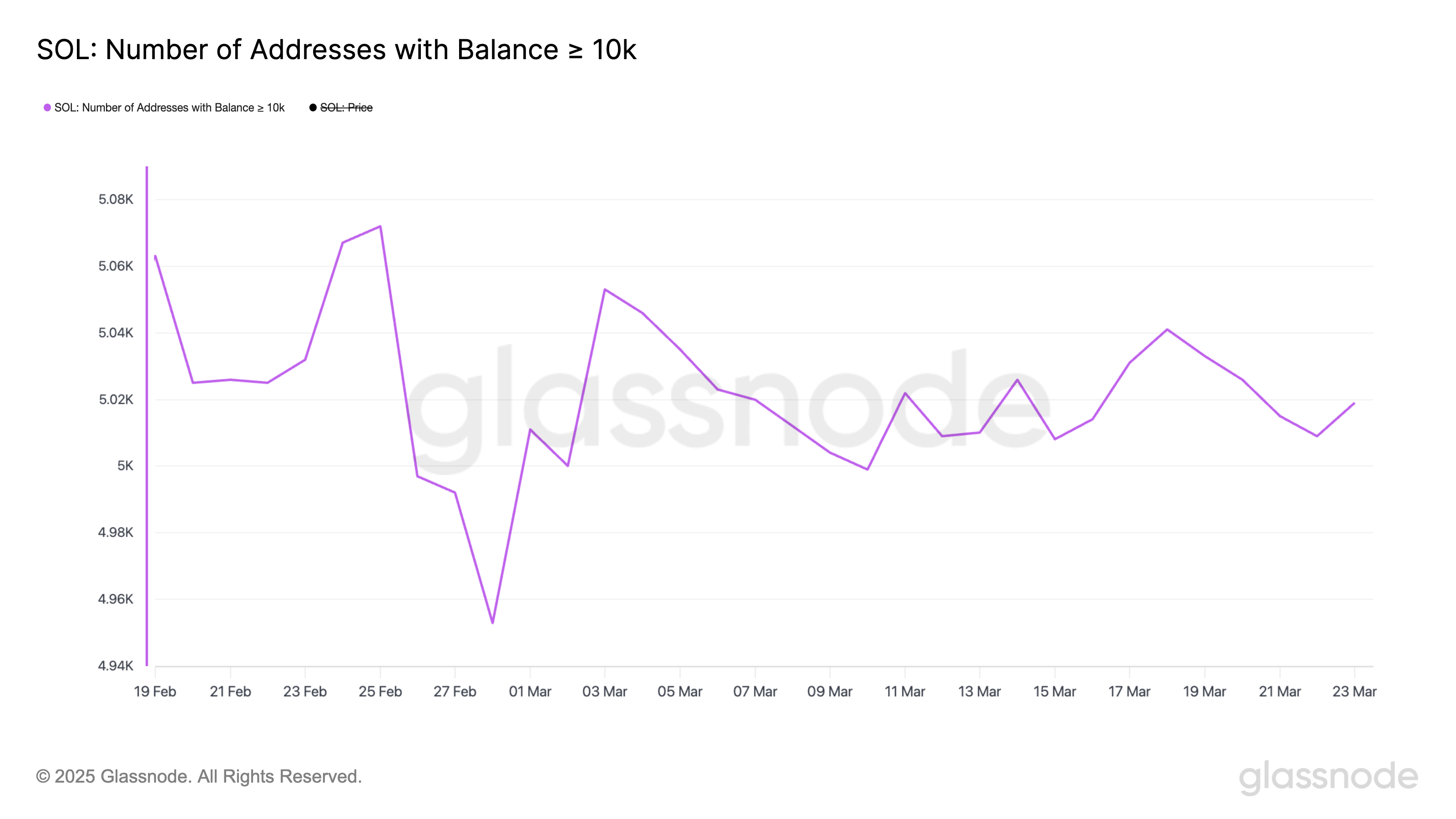 Solana kitlari soni – kamida 10,000 SOL saqlaydigan hamyonlar – hozirda 5,019 ni tashkil etadi, bu 18 martda qayd etilgan 5,041 dan biroz pastroq.