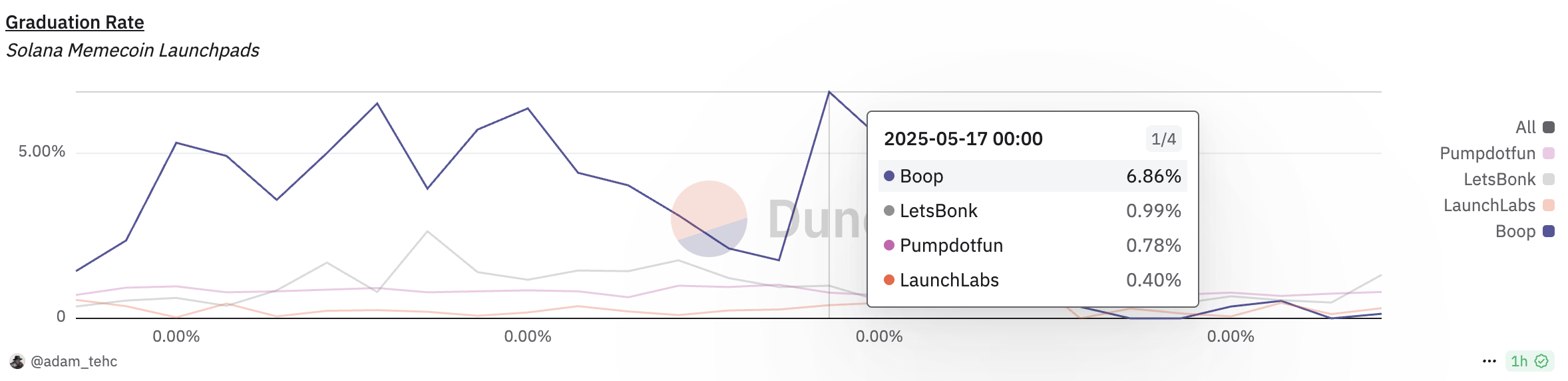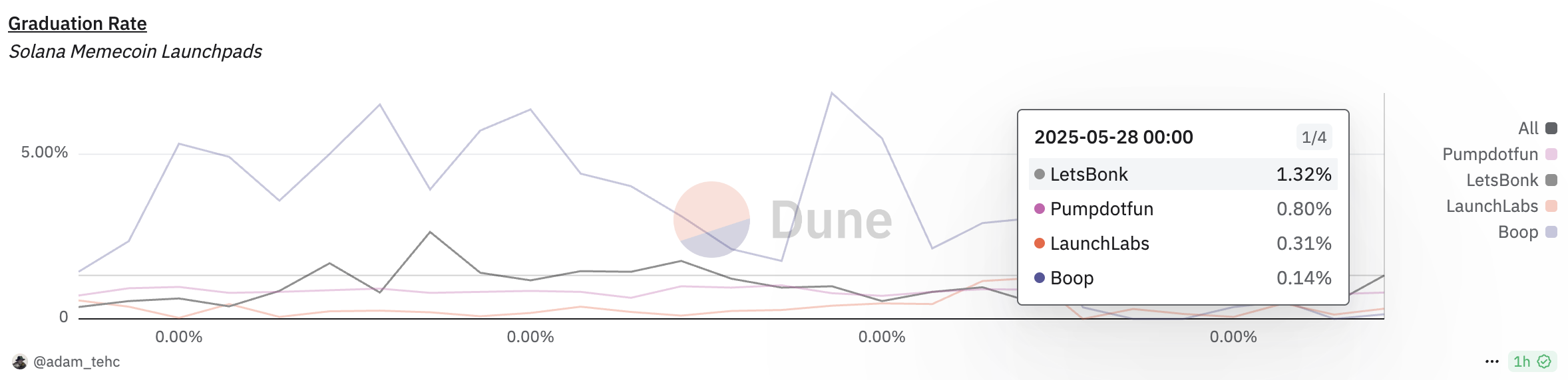 «Dune Analytics» ma’lumotlariga ko’ra, «Pump.fun», «Boop», «LaunchLab» kabi yirik token ishga tushirish platformalari bitiruv darajalarining 1% dan pastga tushganini ko’rsatmoqda. Xususan, 28-may holatiga ko’ra, «Pump.fun» 0.80% bitiruv darajasi bilan yetakchilik qilmoqda.