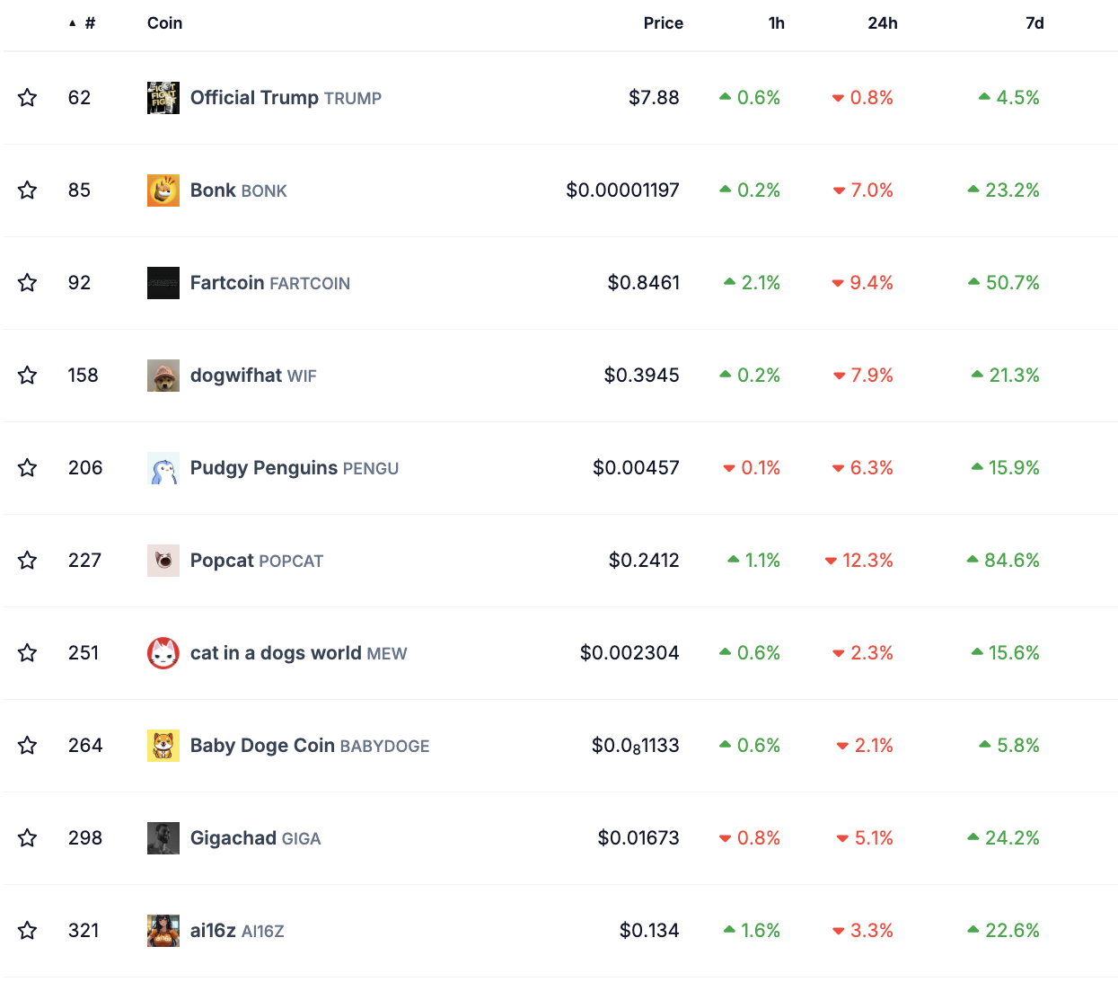 Bu haftada yo’qotish ko’rsatgan ikki tangadan biri TRUMP bo’lib, u tariflar bilan bog’liq tartibsizliklar va so’nggi token ochilishidan salbiy ta’sir ko’rdi. Shunga qaramay, u 4.5% narx o’sishiga erishdi. Eng katta o’ntalikning ko’pchiligi bu davrda 20% dan ortiq o’sish ko’rsatdi.