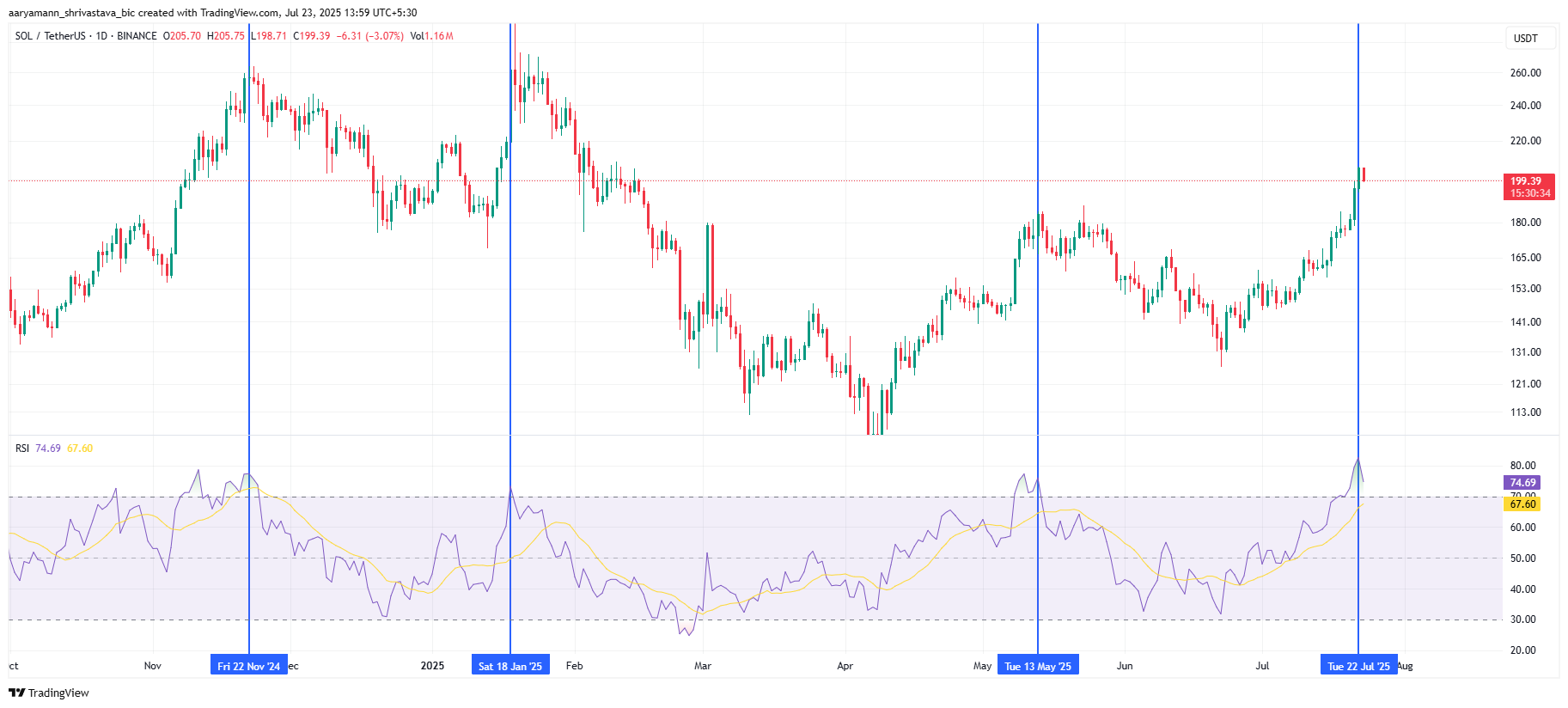 «Solana»ning texnik indikatorlari ham ehtiyotkorlikni ko’rsatmoqda. Nisbiy kuch indeksi (RSI) hozirda 70 dan yuqori bo’lgan haddan tashqari sotib olingan zonada joylashgan. Bu «Solana»ning potentsial tuzatishga tayyorligini ko’rsatadi, chunki bunday darajalar tarixan narxning pasayishi bilan kuzatilgan. RSI avvalgi haddan tashqari sotib olingan zonalarga kirishi narx tuzatishlariga olib kelgan va bu safar ham bundan farq qilmasligi mumkin.
