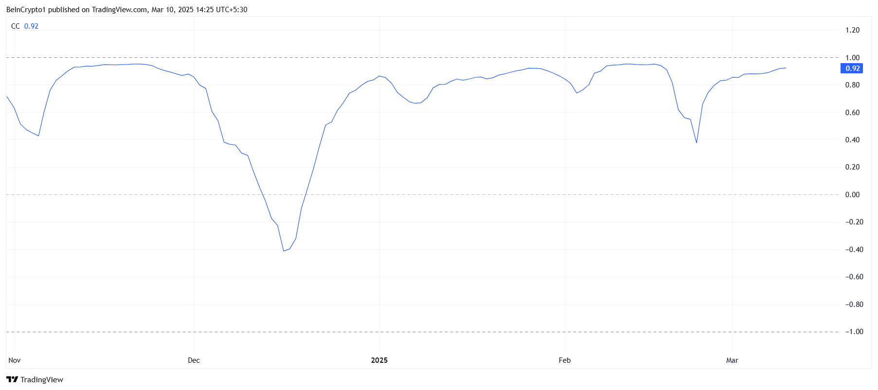 Solana Bitcoin bilan kuchli korrelyatsiyani saqlab turibdi, hozirda 0.92 darajasida. Yuqori korrelyatsiya odatda bozorning ijobiy yo’nalishini ko’rsatsa-da, SOL holatida bu ayiqcha ko’rsatkichdir. Bitcoin $80,000 dan yuqorida ushlab turishga qiynalayotganligi sababli, BTCning har qanday zaifligi Solanani ham pastga tortishi mumkin.