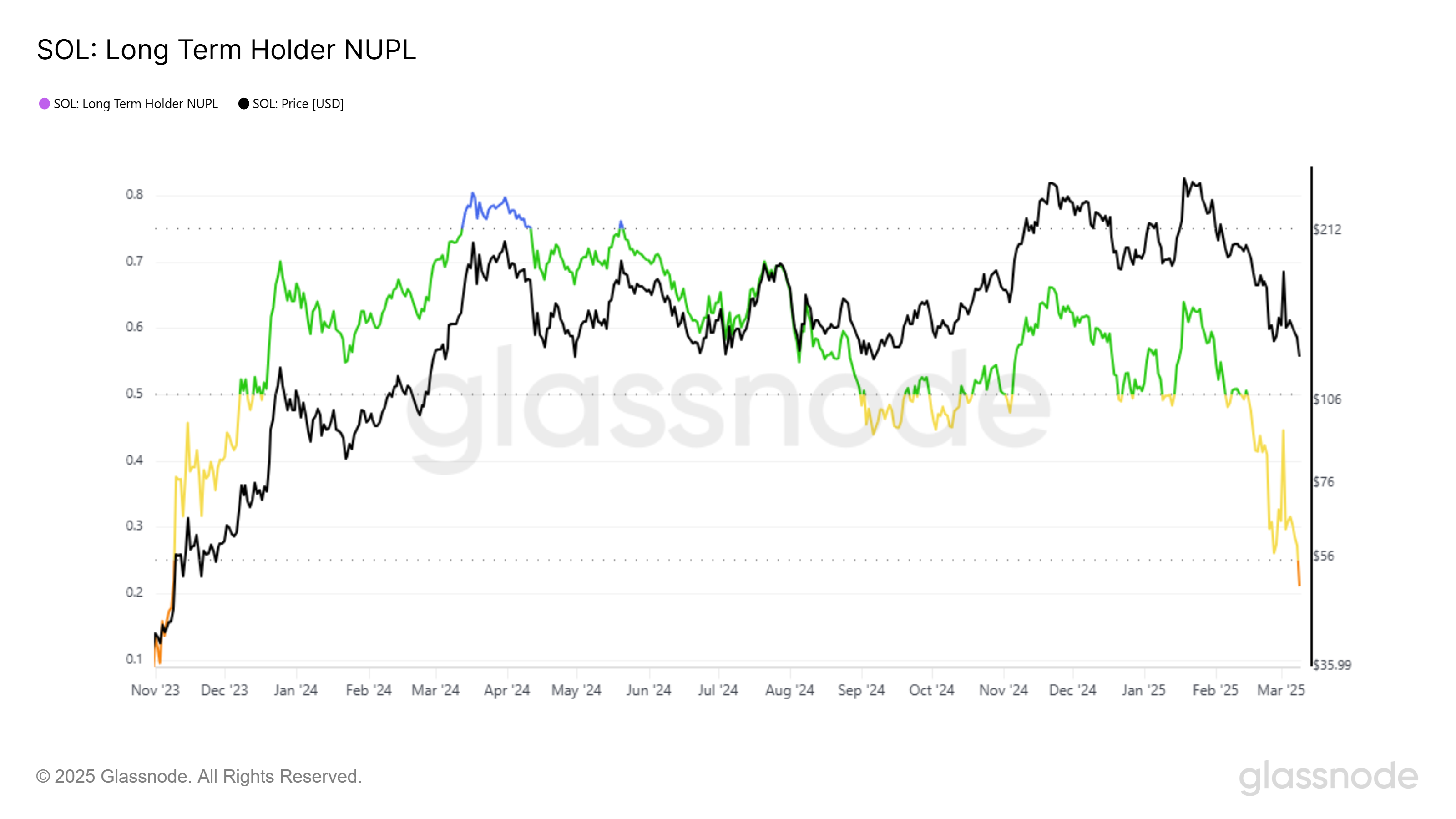Solananing Uzoq muddatli Egasi Sof Realizatsiya Qilinmagan Foyda/Zarar (LTH NUPL) Qo’rquv zonasiga kirib, bozorning kuchaygan tashvishini ko’rsatmoqda. Hozirda 16 oylik past darajada bo’lib, bu ko’rsatkich SOL investorlariga kengroq bozor pasayishining ta’sirini aks ettiradi. Uzoq muddatli egalari yo’qotishlarni oshirayotgan bir paytda, sezilarli sotish bosimi potentsiali oshadi, bu esa yanada pasayish xavfini tug’diradi.