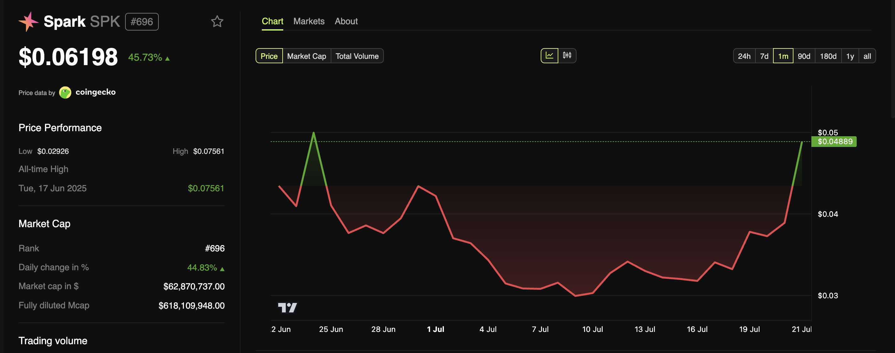 «Spark» (SPK), «Spark» markazsizlashtirilgan moliya (DeFi) protokoliga tegishli kriptovalyuta, o‘tgan hafta davomida qiymati taxminan 100% ga oshdi. Bu o‘sish «Ignition» airdropining ikkinchi bosqichiga bo‘lgan qiziqish ortishi bilan bog‘liq.