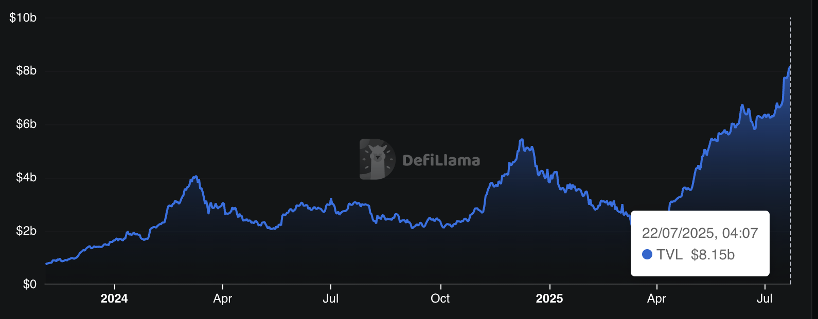 Ayni paytda, o‘sish faqat narx bilan cheklanmaydi. «DefiLama» ma’lumotlariga ko‘ra, Sparkning TVLi bugun yangi cho‘qqiga – 8.15 milliard dollarga yetdi.