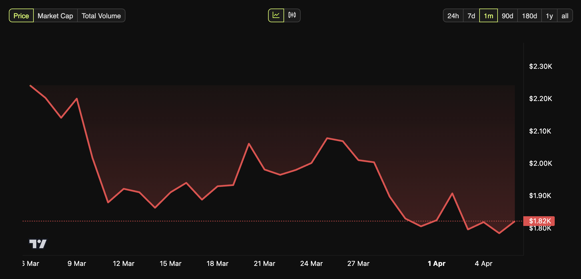 BeInCrypto ma’lumotlariga ko‘ra, ETH o‘tgan hafta davomida 4.8% ga tushib ketdi, haftalik yo‘qotishlar 17.1% ga yetdi. Ushbu maqola yozilayotgan paytda, altkoin $1,822 da savdo qilinmoqda, bu esa kunlik 0.8% kichik o‘sishni aks ettiradi.