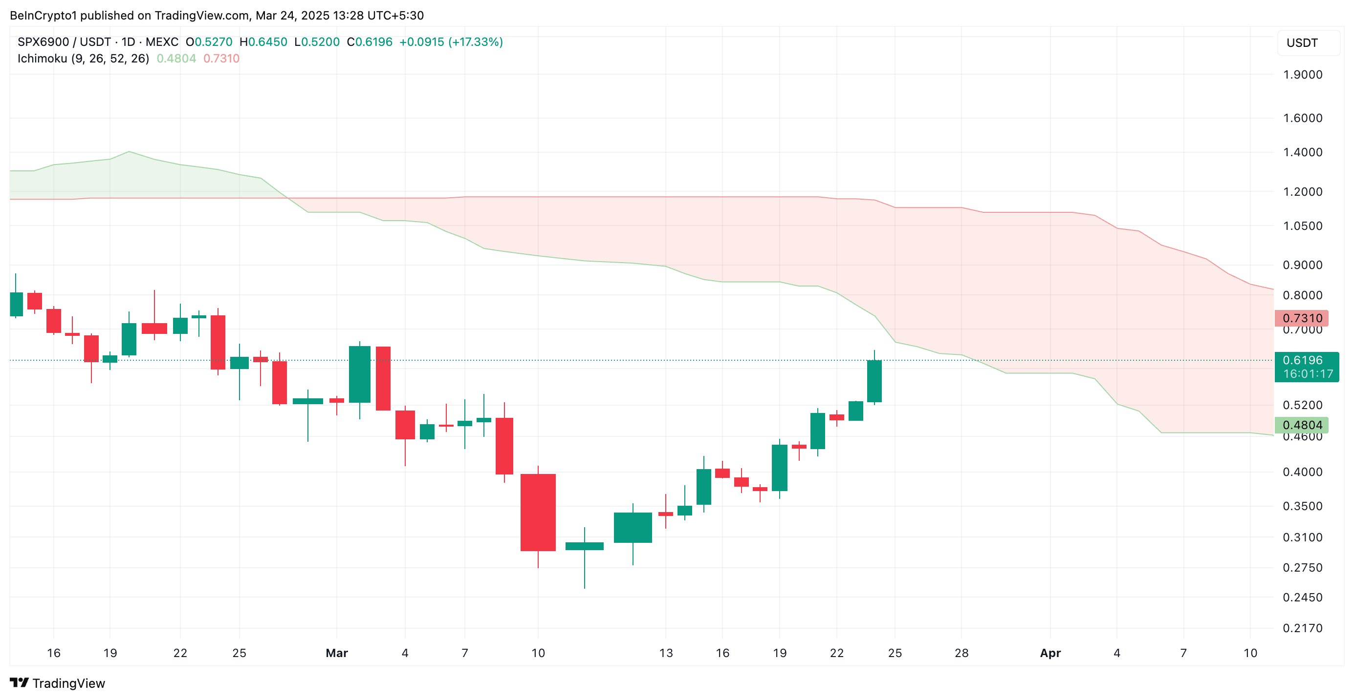 Bu kuchli sotib olish bosimini bildiradi va qo’llab-quvvatlash darajasi sifatida xizmat qiladi, bu SPXning ijobiy tendensiyada ekanligini ko’rsatadi. Agar bu davom etsa, uning narxi Leading Span A dan yuqoriga chiqib, $0.67 ga yetishi mumkin.