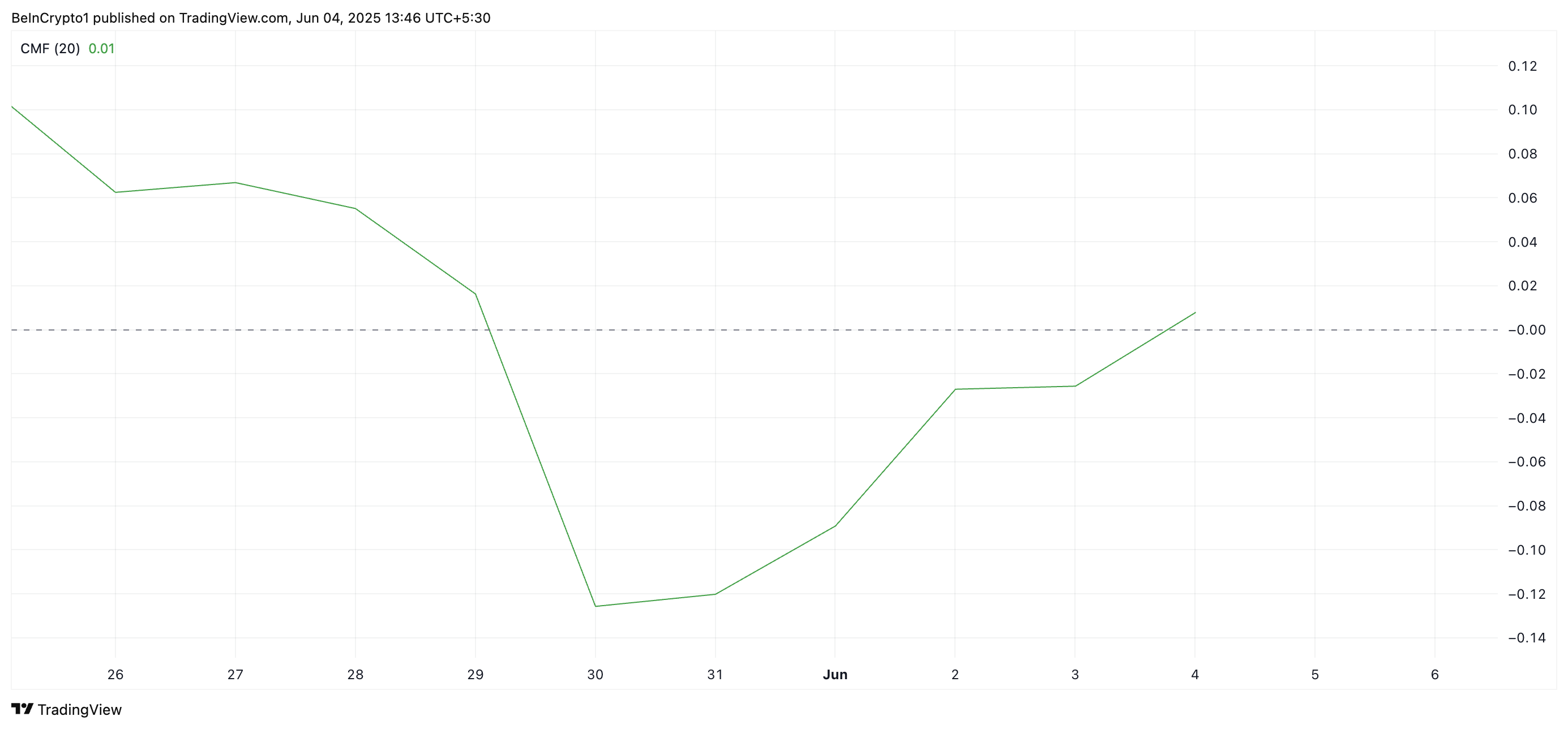 Bundan tashqari, Chaikin Pul Oqimi (CMF) indikatori «SPX»ning ikki xonali narx o’sishi sotib olish bosimi bilan qo’llab-quvvatlanayotganini ko’rsatadi. Hozirgi vaqtda CMF 0.01 da turibdi va neytral nol chizig’idan yuqoriga o’tdi, bu esa yig’ilishning sotish faoliyatidan sezilarli darajada ustunligini bildiradi.