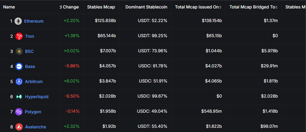 Ethereum taxminan 126 milliard dollarlik stablcoinlarni joylashtiradi, Tron (TRX) esa 65 milliard dollar bilan ortidan keladi. Ikkala tarmoq ham stablcoin aylanishida eng yuqori darajaga yetdi.
