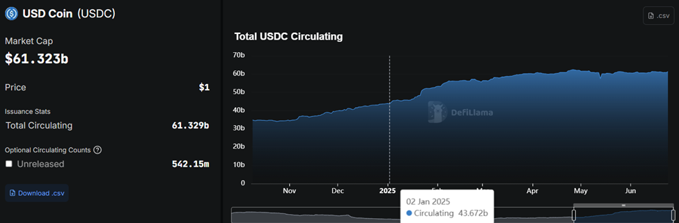 DefiLlama ma’lumotlariga ko’ra, Circle-ning USDC ta’minoti yanvar oyidagi 43.672 milliard dollardan ushbu yozuv holatiga ko’ra 61.323 milliard dollarga ko’tarildi. 40 yildagi 2025% o’sish fiat bilan qo’llab-quvvatlanadigan tokenlar uchun o’sib borayotgan jozibani anglatadi.