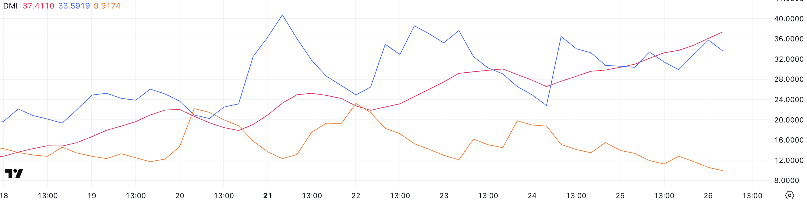 XLMning +DI hozirda 33.59 da. U ikki kun oldin 22.81 edi, lekin yaqinda 36.47 ga yetgan cho’qqidan biroz pastga tushdi. Bu qisqa muddatli o’zgaruvchanlikni ko’rsatadi, lekin umumiy sotib olish bosimi kuchli bo’lib qolmoqda.
