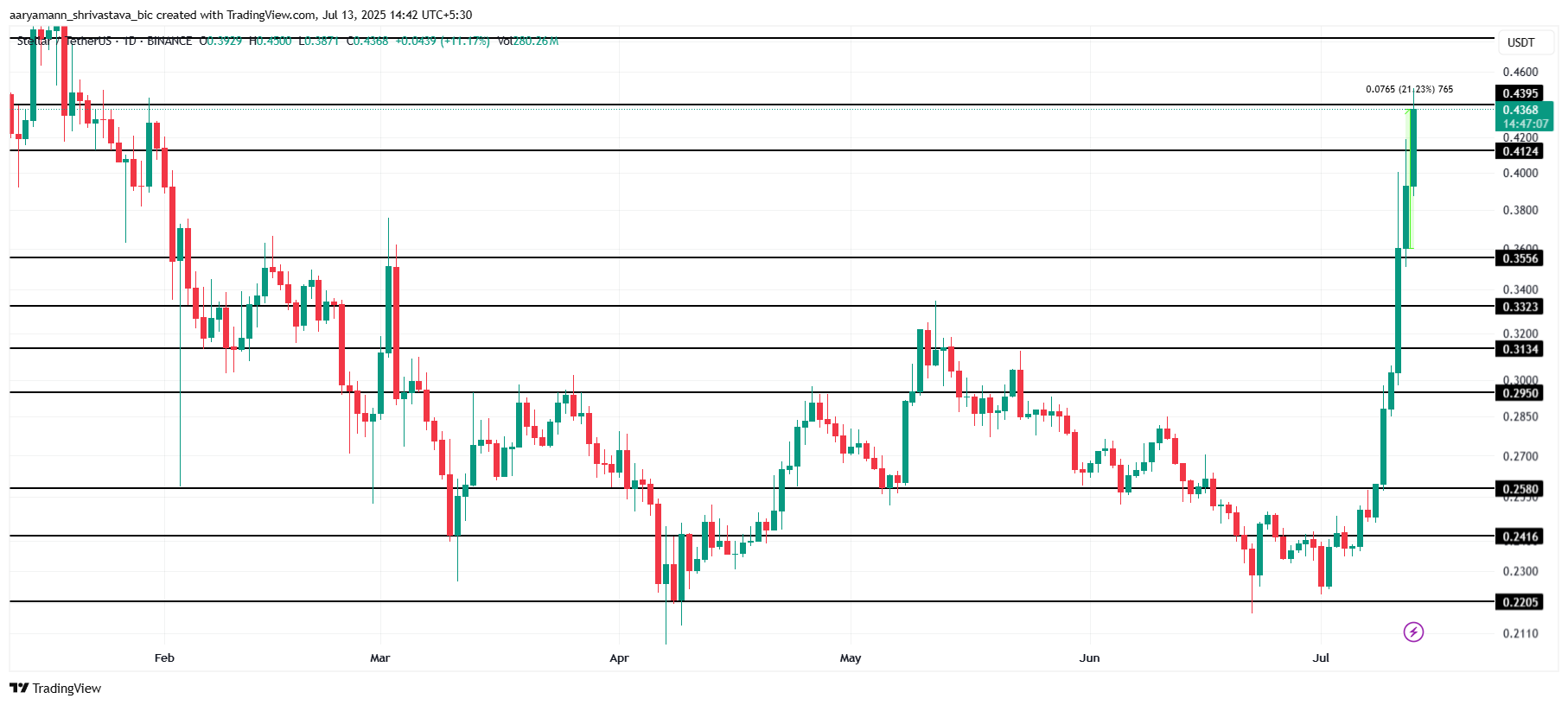 XLM narxi so’nggi 24 soatda 21% ga oshdi va $0.436 ga yetdi, bu esa $0.439 kritik qarshilik darajasidan biroz pastda. Altkoin bu oyda 83% ga o’sdi, bu esa investorlarning qiziqishi ortayotganini aniq ko’rsatadi.