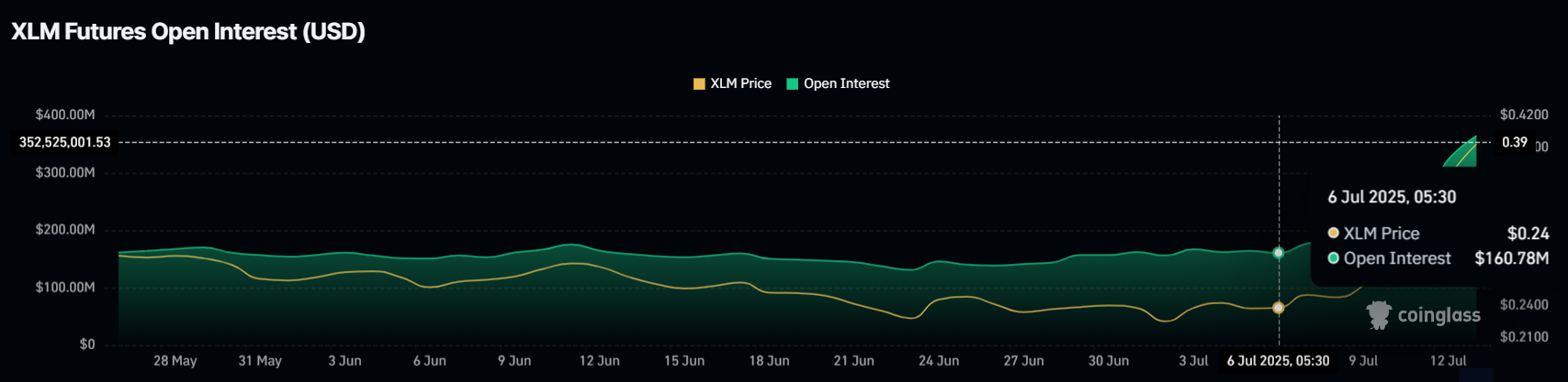 XLM uchun Ochiq Foiz (OI) keskin oshdi, o’tgan haftada $160 milliondan $346 millionga, ya’ni 127% ga ko’tarildi. Bu OI o’sishi investorlarning faolroq bo’layotganini ko’rsatadi, ehtimol, qolib ketishdan qo’rqish (FOMO) tufayli.