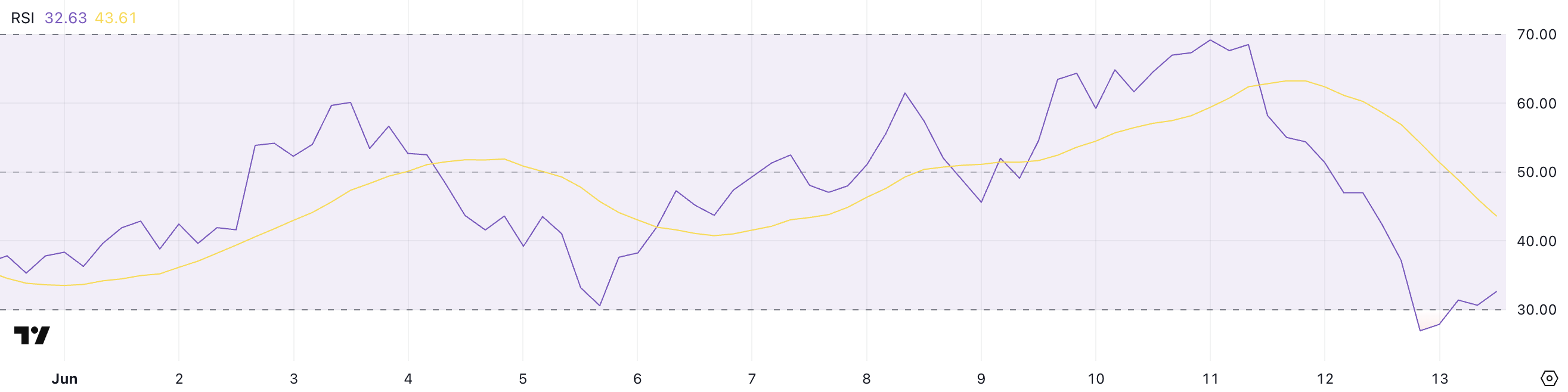 RSI – bu harakatlanish osilatoridir, u narx o’zgarishlarining tezligi va kattaligini 0 dan 100 gacha bo’lgan o’lchovda o’lchaydi. 70 dan yuqori ko’rsatkichlar odatda aktivning haddan tashqari sotib olinganligini va tuzatishga muhtojligini ko’rsatadi, 30 dan past qiymatlar esa haddan tashqari sotilganligini va tiklanishga tayyorligini bildiradi.
