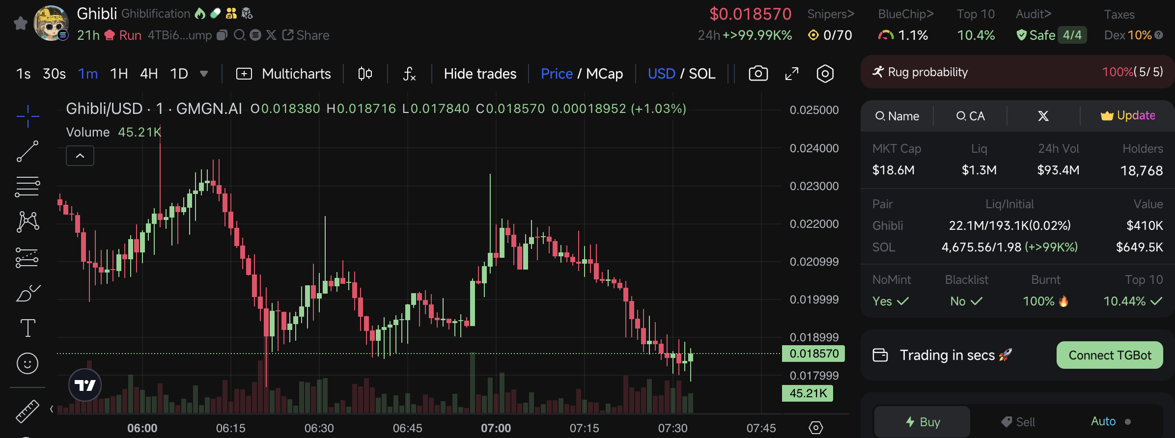 Ko’plab Ghibli mavzusidagi tokenlar Pump.fun, DexScreener va GMGN da paydo bo’ldi. Ular orasida, Solana (h9d3…dqs7) da Ghibli Token eng yaxshi ko’rsatkichga ega. gmgn.ai ma’lumotlariga ko’ra, ushbu token atigi bir soatda 52.54% o’sishni qayd etdi va bozor qiymati 23 million dollarga yetdi.