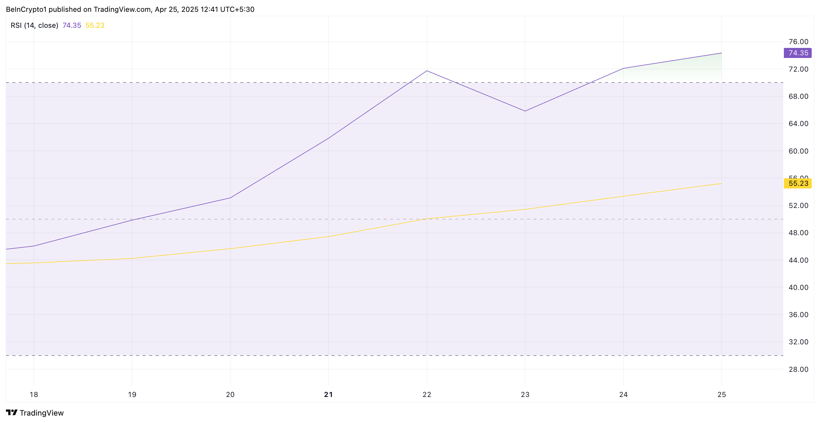 Biroq, RSI ko’rsatkichi 70 dan yuqori bo’lishi har doim ham darhol pasayishni anglatmaydi. Kuchli optimistik harakat ba’zan o’sishni davom ettirishi mumkin, ortiqcha sotib olingan sharoitlarga qaramay, narxlarni yanada yuqoriga ko’tarishi mumkin.