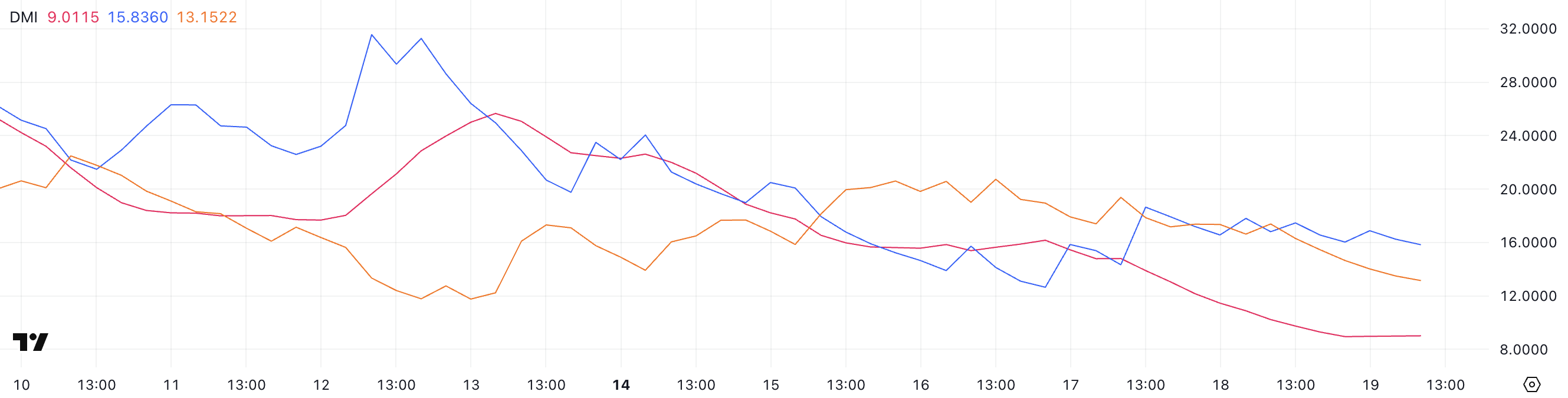 Ayni paytda, SUI ning DMI (Yo’nalishli Harakat Indeksi) ADX ni 9 ga tushganini ko’rsatmoqda, ikki kun oldin 14.79 edi. ADX trend kuchini o’lchaydi va 20 dan past ko’rsatkichlar zaif yoki mavjud bo’lmagan trendni bildiradi.