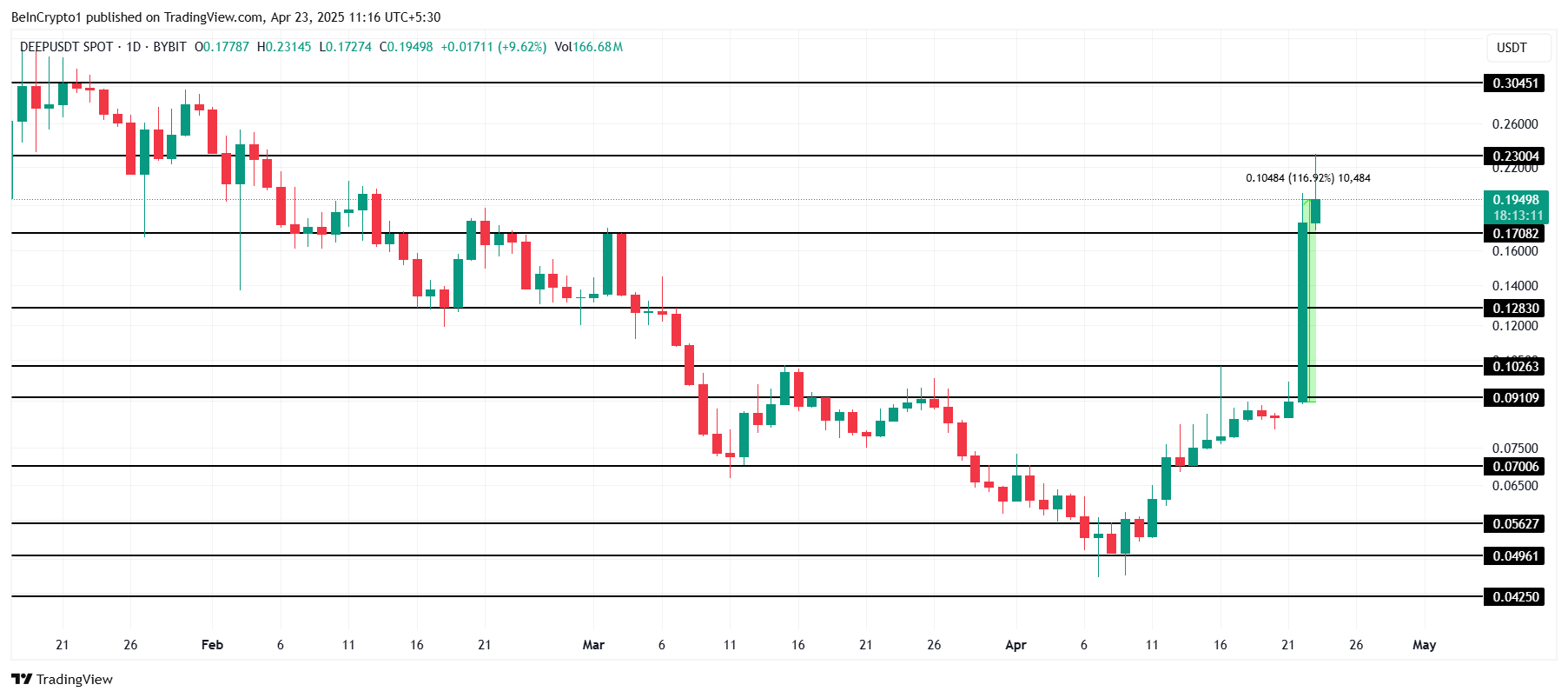 DEEP tokeni so’nggi 24 soat ichida 116% ga oshdi va hozirda $0.194 da savdo qilinmoqda. Bu o’sish DEEPni SUI ekotizimidagi eng yaxshi natijaga erishgan token qildi. Altkoin kuchli imkoniyatlarni ko’rsatmoqda va yaqin kelajakda $0.230 dan yuqoriga chiqishni maqsad qilmoqda, bu esa ijobiy prognozni anglatadi.