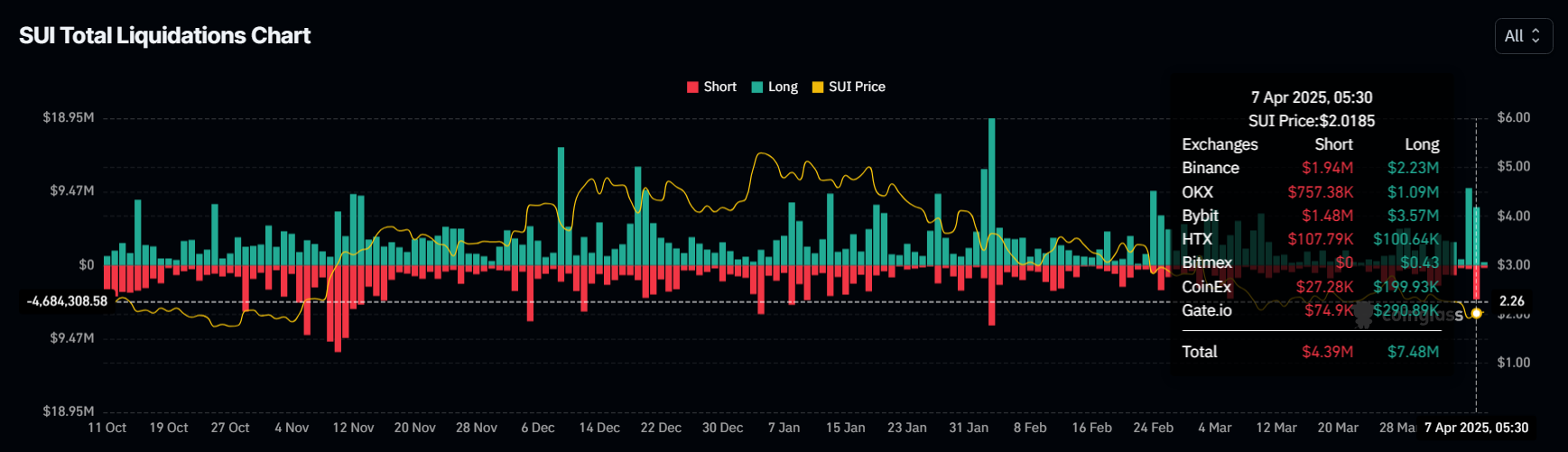 Fyuçers bozorlari ma’lumotlari SUI yaqinda qisqa likvidatsiyalarda ikki oylik yuqori darajaga erishganini ko’rsatadi, bu bir kunda jami $12 million likvidatsiyaga olib keldi. Ushbu likvidatsiyalar treyderlar orasida ortib borayotgan shubhani aks ettiradi, chunki ko’pchilik o’z pozitsiyalarini yopishga majbur bo’ldi. Likvidatsiyalar SUI treyderlari duch kelgan qiyinchiliklarni ko’rsatadi, ularning optimistik qarashlari amalga oshmadi.